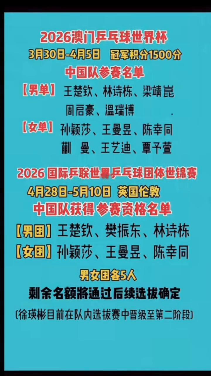 2026澳门乒乓球世界杯,3月30日-4月5日冠军积分1500分。 中国队参赛名单: ·【男单】:王楚钦、林诗栋、梁靖昆、周启豪、温瑞博。 ·【女单】:孙颖莎、王曼昱、陈幸同、蒯曼、王艺迪、覃予萱。 2026国际乒联世界乒乓球团体世锦赛,4月28日-5月10日英国伦敦。 中国队获得参赛资格名单: ·【男团】:王楚钦、樊振东、林诗栋。 ·【女团】:孙颖莎、王曼昱、陈幸同。 男女团各5人,剩余名额将通过后续选拔确定。 徐瑛彬目前在队内选拔赛中晋级至第二阶段。