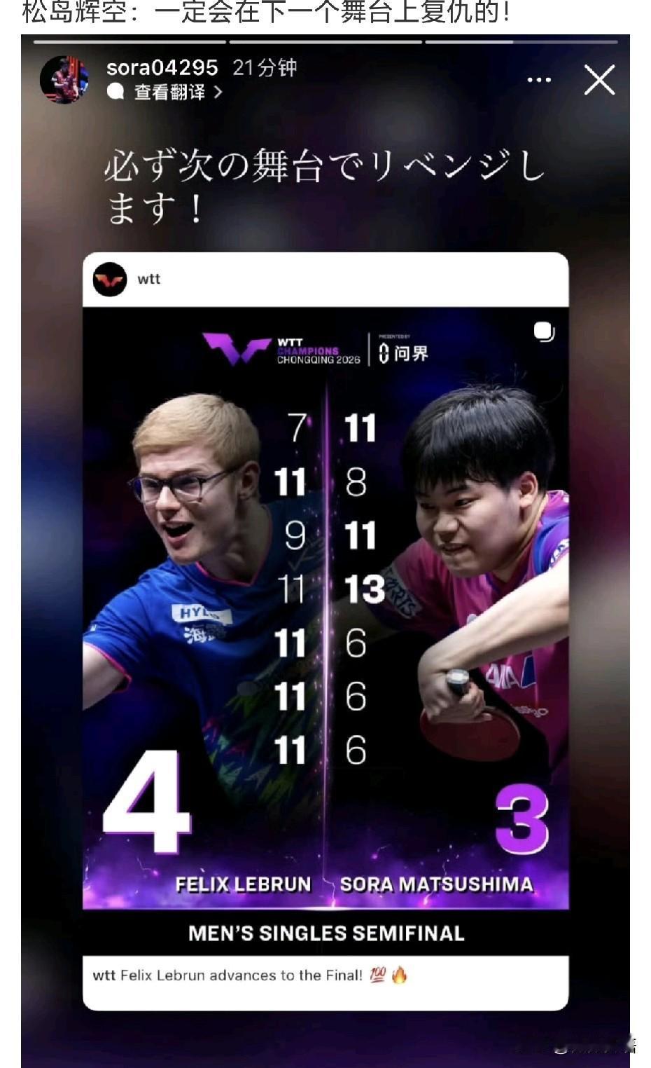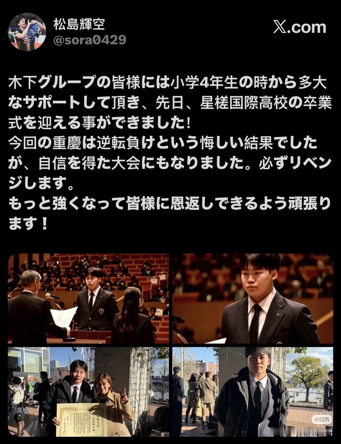 原来松岛辉空才刚刚高中毕业,就是他长得有点成熟,又一直参加成人赛,总觉得他挺大的了,实际松岛辉空才18岁。这次重庆冠军赛,在半决赛中松岛辉空是在大比分1-3领先时,菲利克斯·勒布伦连追3局,三局都是11-6赢了,以4-3战胜了松岛辉空,小布晋级决赛,决赛中小布又赢了温瑞博,拿到了重庆冠军赛男单冠军。 在比赛结束后,看到松岛辉空就发了ins,他说:“一定会在下一个舞台上复仇的”。松岛辉空之前输给王楚钦后哭了,这次重庆冠军赛松岛辉空做了充足的准备,他自己也说自己为这场比赛付出了很多的努力,也一直认真研究过。接下来小布就是松岛辉空的重点研究对象了。 回到日本狗,松岛辉空又更新了动态:“感谢木下集团各位自小学四年级起给予的大力支持,我目前顺利完成了星槎国际高中的毕业典礼!本次重庆赛事虽以遗憾逆转失利告终,但也成为了收获自信的一站。我定会复仇归来。为了变得更强、回报各位的恩情,我会继续全力以赴! ”松岛这是满脑子都是复 仇了,哈哈。不过小布在比赛场上似乎比松岛辉空情绪更稳定,小布打球快,反应也快,而且也挺会打逆风球,这次在重庆夺冠,小布对自己的直板打法也更加自信了。