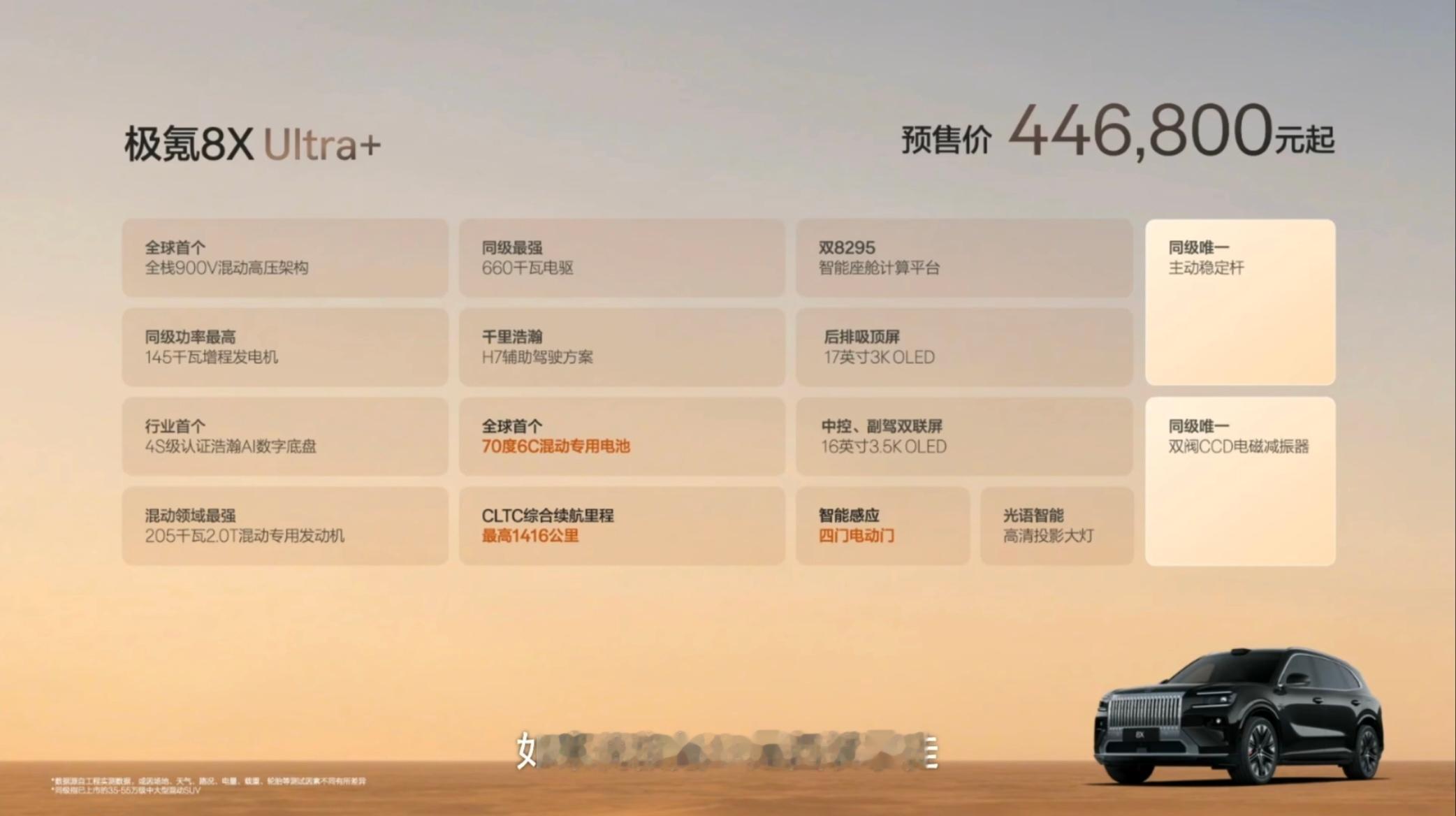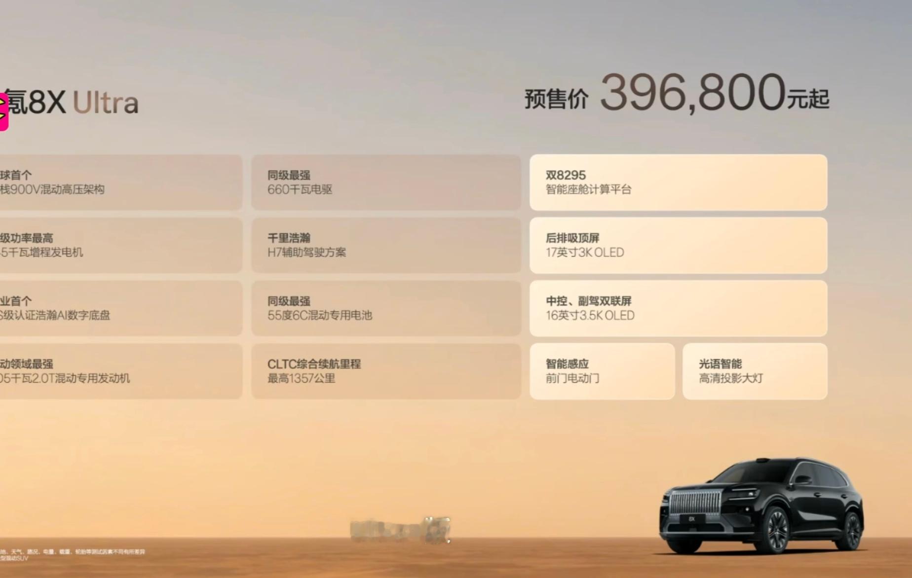 布局:2+3(大五座/六座)基础参数:5108*2026*1780mm,轴距:3069mm(中大型SUV)驱动形式:电混(三电机四驱)发动机:2.0T发动机功率:205kW电机功率:前290/后740kW零百加速:2.96-3.7s纯电续航:410km充电平台:900v/6C电池容量:70kWh悬挂:双腔空悬(可调)+CCD+主动稳定杆智驾辅助:千里浩瀚H9智驾硬件:激光雷达*5智驾芯片:Nvidia Thor U*2车机芯片:8295p*2轮毂尺寸:20-22寸+布雷博6活塞卡钳屏幕:16英寸中控屏+17寸后排娱乐屏+44寸HUD外观:红/灰/黑/黑灰/白内饰:纯黑/棕黑/白黑/红黑+翻毛皮顶棚座椅:前后排电调+加热+通风+按摩/右后伊姆斯躺椅(零重力)/后排小桌板/电动后排遮阳帘/三排!加热电调音响:Naim 29扬声器(含头枕音响+车外扬声器)+主动降噪后备箱:1133L/放倒二排2200L/视觉感应后备箱/尾箱220v插座其他:9.5L冷暖冰箱/电动踏板/自动门/2*50w无线充37.68万 Max版320km续航/900v/55度电/6c/双电机四驱/双腔空悬660kW电机/零百3.7s/单Thor-U芯片/21寸轮毂二排右侧躺椅/电动踏板/千里浩瀚H739.68万 Ultra版318km/双8295p+17后排娱乐屏/前排双16连屏/流媒体后视镜/29扬声器/高清投影大灯44.68万 Ultra+版70度电/410km四门电动门/双CCD/主动稳定杆51.68万 曜影版三电机1030kW/双腔空悬/CCD/零百2.96s22寸锻造轮毂/运动座椅/运动方向盘/座舱碳纤维装饰/一键超频/千里浩瀚H9+5激光雷达3000抵10000(等于折扣7000)+10000元可选6坐(Ultra版以上)Ultra以上送Naim 29扬max/ultra送21寸轮毂+卡钳Ultra+送22寸轮毂+卡钳不要千里浩瀚H9顶配-2.5万教授觉得低配也可以,但会缺前排一个副屏,后面少一个高清屏,续航只有320km,但基本够用。比较合理的配置是39.68万的Ultra版,这个版本配置基本配齐,零百加速也到了3.7s。44万的Ultra+只是加强了电池包、4个电动门和ccd稳定杆,因此需要运动的话,还是一步到位直接顶配比较好。对于教授来说,这车也或许完美了,只能说最大的缺点就是顶配太贵,低配和次低配也很香啊。