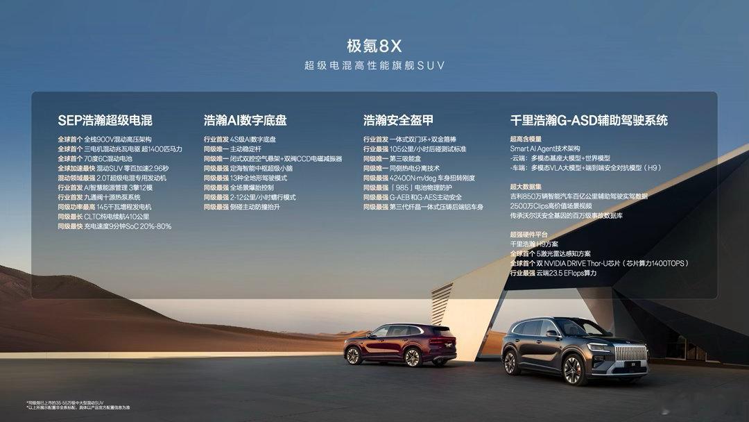 等到了极氪8X发布,参数依旧很顶!跟极氪9X同源,但8X属于大五座定位它们喜欢称极氪8X叫“杭州湾卡宴”极氪8X全栈900V高压架构那块70度大电池支持6C快充,20-80%仅9分钟混动领域首个三电机,发动机是2.0T的底盘是双腔空悬、双阀CCD和主动稳定杆从硬件层面看,极氪8X够顶级了而目前看到的内装状态,舒适度和豪华度高分就看车厢还有多少法宝没揭秘了