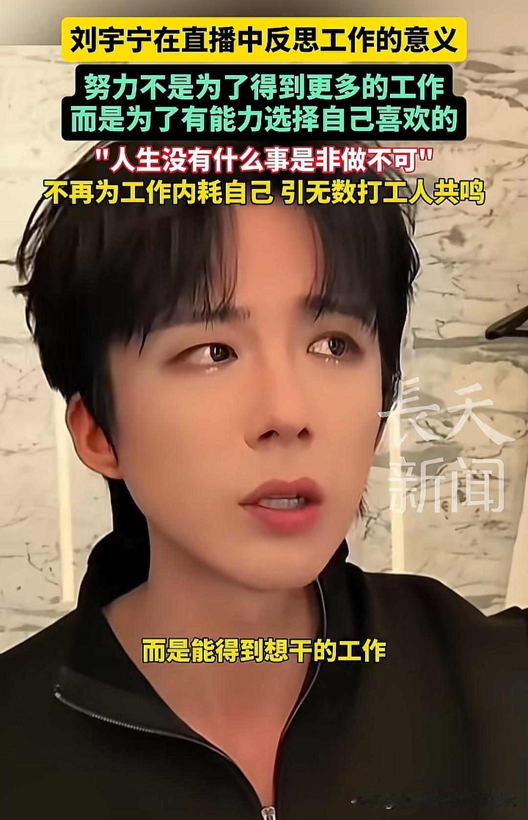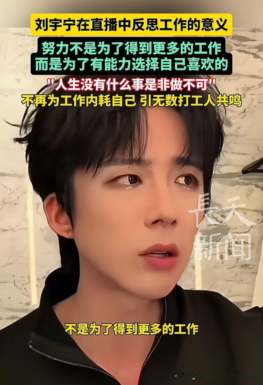 刘宇宁谈工作意义:有人共情,有人扎心,这就是打工人的现实 刘宇宁在直播里说“努力不是为了得到更多工作,而是为了有能力选择自己喜欢的”,这话戳中了很多打工人的内心,但也有人说“那是因为他已经赚到了,我们连工作都快找不到了”。其实这两种心情,都太真实了。 对那些已经在行业里站稳脚跟的人来说,工作的意义确实会从“生存”转向“选择”。就像刘宇宁,从街头唱歌到现在有选择权,他的感悟是自己一步步拼出来的。但对更多普通人来说,我们每天都在为“保住工作”“赚到房租”“凑够生活费”奔波,别说选择喜欢的工作,能有一份稳定的收入就已经很不容易了。 可即便如此,我还是觉得刘宇宁的话有值得我们思考的地方:努力工作的终极目标,不该是被工作绑架,而是慢慢攒够选择权。也许现在我们还在为生存奔波,但可以在工作里偷偷攒点“资本”——可能是一项技能,可能是一点积蓄,可能是人脉。这些东西,会在未来某一天,让我们有底气对不喜欢的工作说“不”。 最后想对所有打工人说:别太苛责自己,也别放弃希望。我们不用和别人比,只需要和昨天的自己比,今天比昨天多攒了一点底气,就已经很棒了。你现在的工作状态是怎样的?评论区聊聊,我们互相打气~