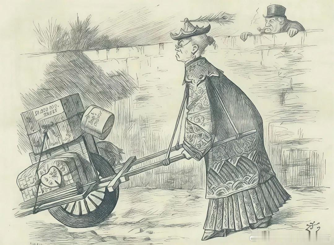 这幅漫画是1900年8月29日英国《Punch(笨拙)》杂志刊登的政治讽刺漫画,无正式标题,通常被称作《狼狈西逃的慈禧》。原画作者是约翰·坦尼尔(Sir John Tenniel),他是19世纪英国最具影响力的政治漫画家,长期担任《Punch(笨拙)》杂志的首席漫画家;而画面上标注的SWAIN,则是指约瑟夫·斯温(Joseph Swain),他是《Punch》杂志专属的雕刻师,负责将坦尼尔的原画制作成印刷用的雕版。约翰·坦尼尔因绘制《爱丽丝梦游仙境》插画、创作近50年的《Punch》政治漫画闻名,1893年被授予爵士头衔;约瑟夫·斯温则是维多利亚时期顶尖的木刻雕版师,与《Punch》合作长达半个世纪,是坦尼尔漫画得以印刷传播的关键人物。历史背景——1900年八国联军攻陷北京,慈禧太后携光绪帝仓皇西逃(清史自称“庚子西狩”),这幅漫画正是西方媒体基于此事件创作的讽刺作品,反映了当时西方对晚清实际统治者慈禧无能而又极度贪婪的讽刺与嘲讽。