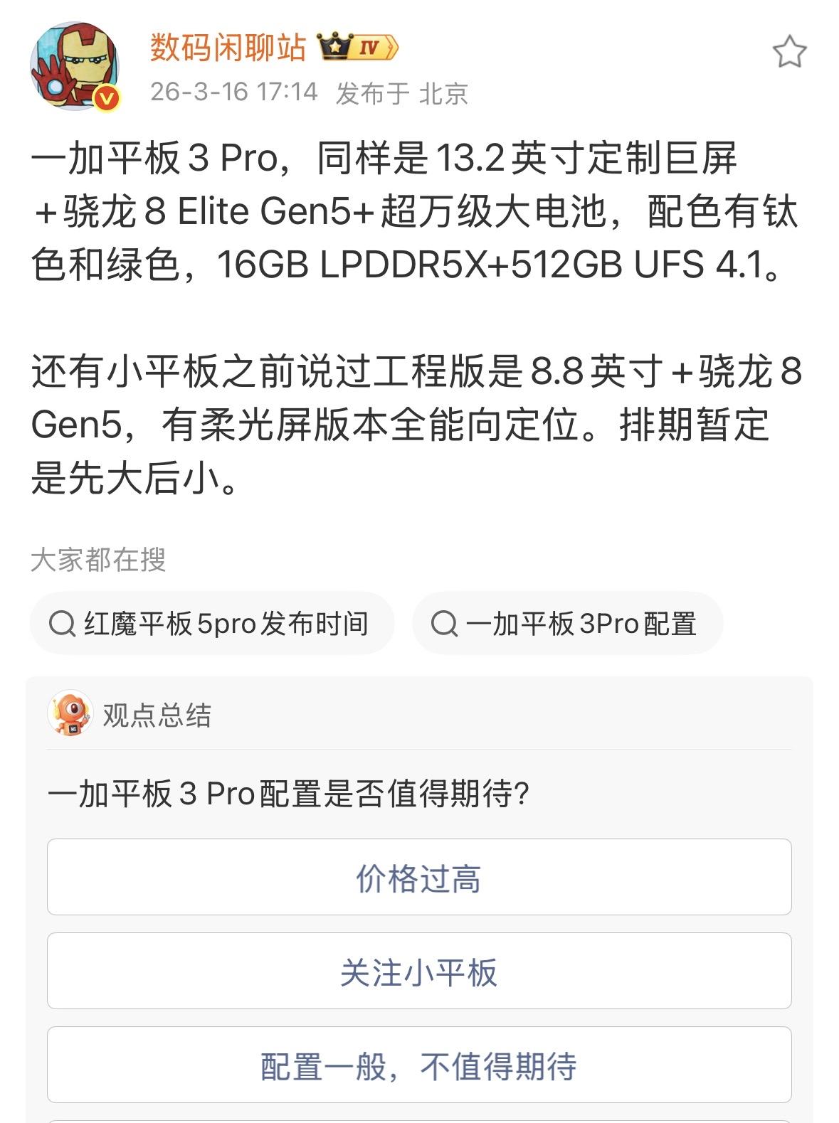 炸裂!一加平板3 Pro配置曝光,骁龙8 Elite Gen5、超万级电池是核心亮点 就在最近,一加平板3 Pro的核心配置浮上水面。据可靠消息,这款新平板将搭载高通骁龙8 Elite Gen5旗舰处理器,配合一加在散热的堆料,性能表现这块自然十分强势,无论是复杂任务处理还是高负载游戏都能轻松应对。 最让我感到震惊的是它的续航,据悉一加平板3 Pro内置超万级大电池,结合SuperVOOC快充技术,续航焦虑将得到有效缓解。存储规格上,包含了16GB LPDDR5X+512GB UFS 4.1 规格可选,读写速度行业领先,真的是好马配好鞍,流畅性这块完全可以放心。 此外,一加平板3 Pro还将提供钛色、绿色等配色可选,配色方面十分丰富,反正我个人是十分期待的,各位说呢?