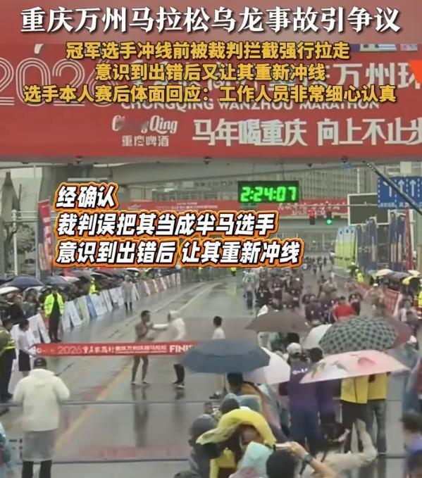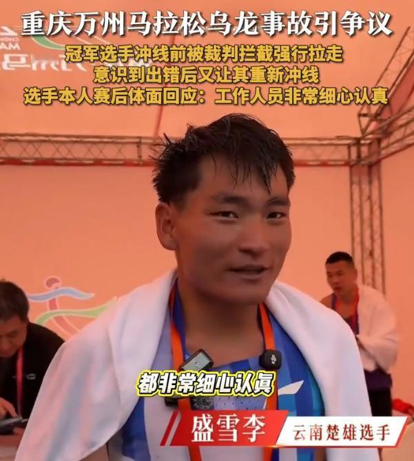 这也太业余了!重庆万州马拉松比赛,男子全马组冠军眼看就要冲线,结果却突然被工作人员拦住,后来发现拦错了,又让他掉头回去重新冲线,虽然并没有影响到最后的结果,但如此操作,也是让网友直呼草台班子。事后组委会解释称裁判因雨水遮挡眼镜导致失误 被拦住的选手叫盛雪李,来自云南楚雄。比赛当天的雨下得着实不小,他全程领跑,是第一个冲向终点的全马选手。计时器显示成绩已经突破了2小时23分,距离终点拱门只剩下十来米 这个距离,对于跑了两个多小时的选手来说,已经是胜利在望的最后冲刺。可就在这节骨眼上,一名终点裁判突然上前,硬生生把他拦在了赛道外 更让人摸不着头脑的是,现场主持人都已经报出了他的参赛号码,这位裁判还是坚持认为他是来抢镜的半马选手,直接把他往旁边的半马赛道推。一个要冲线的人,被推去别的赛道,这事说出去都没人信 几番沟通之后,裁判才意识到搞错了,允许盛雪李掉头回到全马赛道完成冲线。最终他以2小时23分53秒的成绩拿下冠军,刷新了个人最好成绩 事后组委会的解释是,当天雨水太大,裁判的眼镜被雨水遮挡,导致判断失误 不过网友们并不买账,认为这样的失误实在太业余 说实话,盛雪李是幸运的,第二名跟他差距够大,这一拦一回头没影响最终名次。但这事不能因为结果没受影响就这么翻篇 马拉松比赛,选手从发枪到冲线,每一秒都是实打实跑出来的。终点线前的那个瞬间,是他们这一路最难熬的时刻里唯一的盼头。把一个跑了两小时多的人拦在终点外,让他掉头再跑,这本身就已经是对选手极大的不尊重 赛事组织的专业性,从来不是看天气好的时候有多顺畅,而是看突发状况下能不能兜住底。下雨天办赛,遮挡视线的不是只有裁判的眼镜,还有路面湿滑、设备防水、选手保暖等一系列问题 一个有经验的裁判团队,应该提前考虑到这些因素,准备好预案,而不是等问题发生了再去解释眼镜被雨水挡住