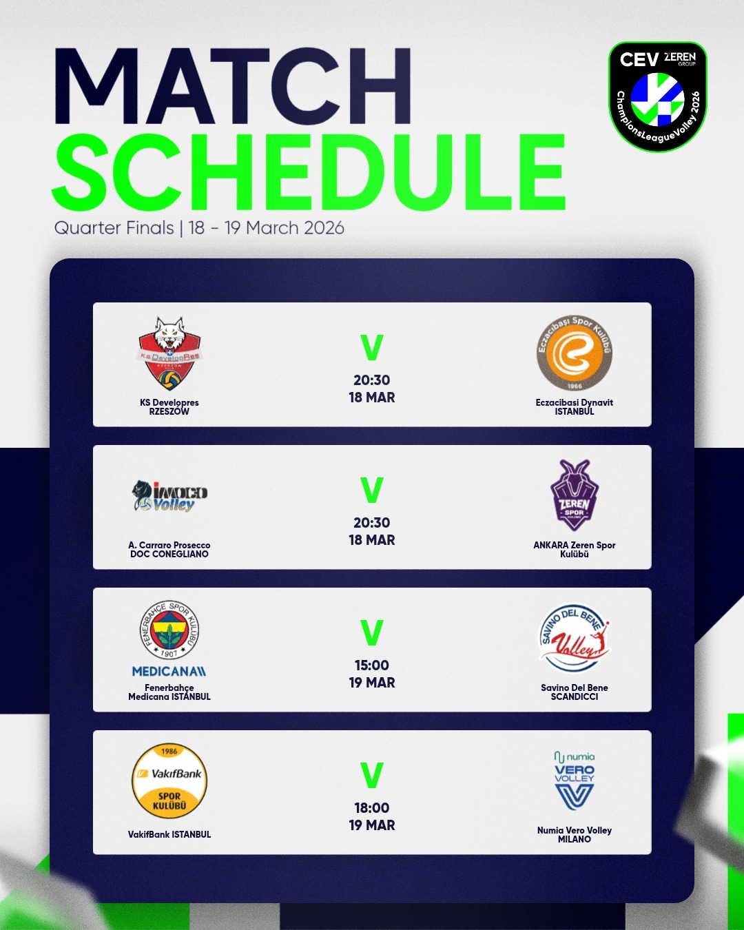 欧冠八进四第二回合较量,两天后,科内利亚诺对泽仁体育,19日凌晨3点30分!朱婷