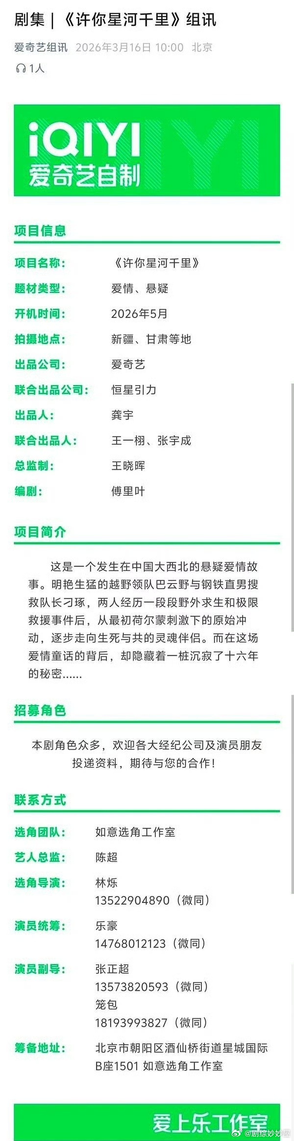 新饼来了!网传虞书欣 敖瑞鹏出演《许你星河千里》,预计5月开机!