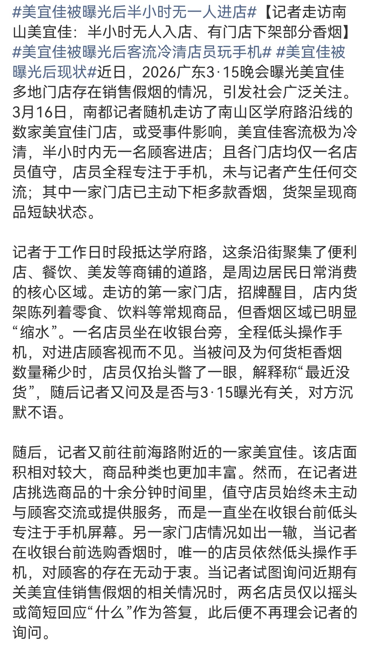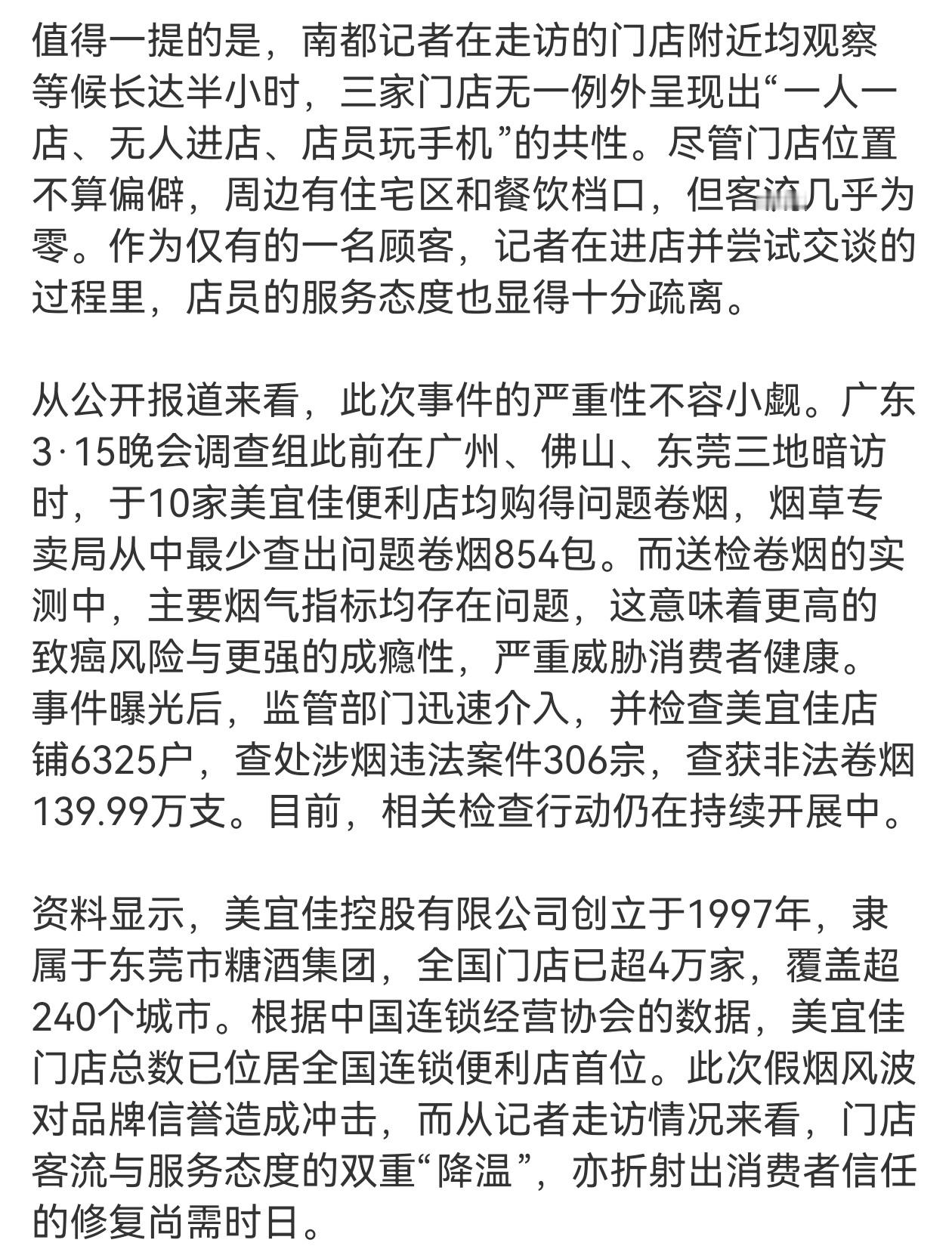 相较于真烟,假烟具有更高致癌风险和成瘾性,面对假烟销售的质疑,美宜佳将责任甩锅给门店,却不正面回应,为何允许门店可从外部非法渠道进货?烟草作为专卖商品,为何没有纳入总部供应链体系?美宜佳被曝光后半小时无一人进店