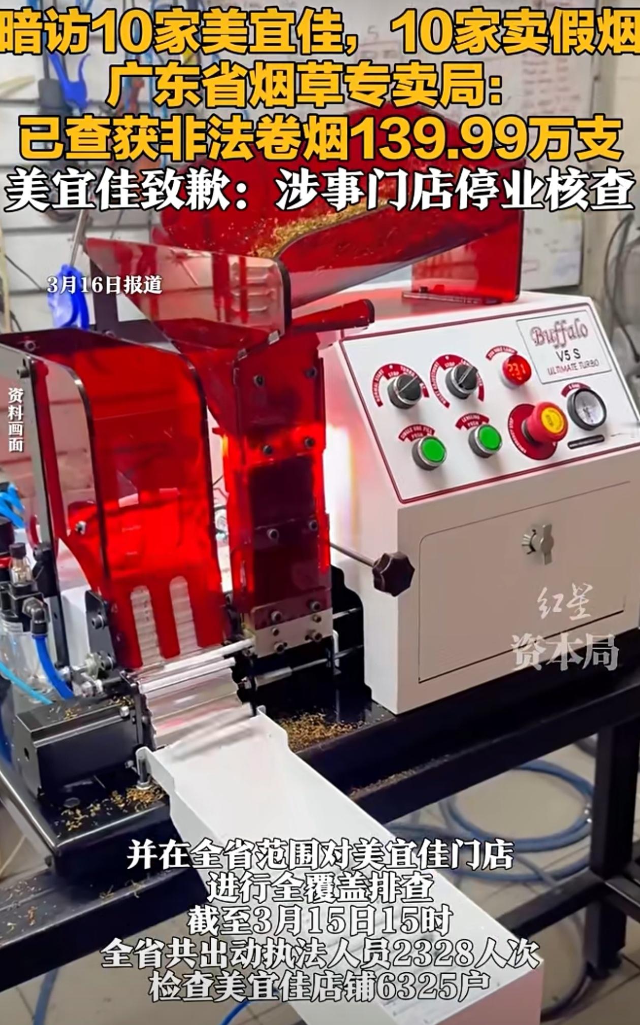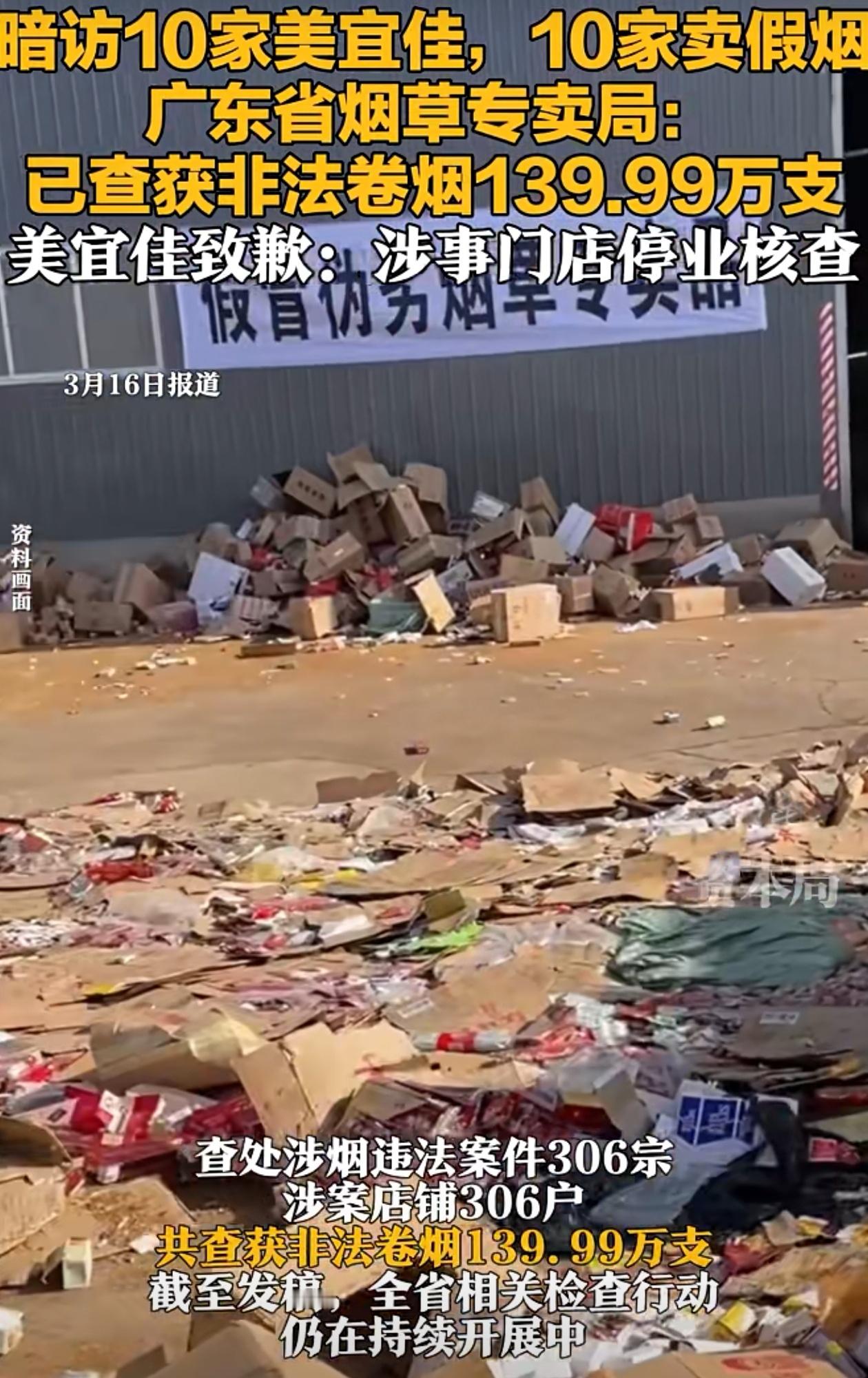 315前夕,记者暗访广州、佛山、东莞三地10家美宜佳门店,10家全部查出销售假烟情况。随后,广东省烟草专卖局一天内检查6325户美宜佳店铺,查处涉烟违法案件306宗,查获非法卷烟139.99万支。美宜佳致歉同时,涉事门店停业核查。美宜佳被曝光后半小时无一人进店时事满谈