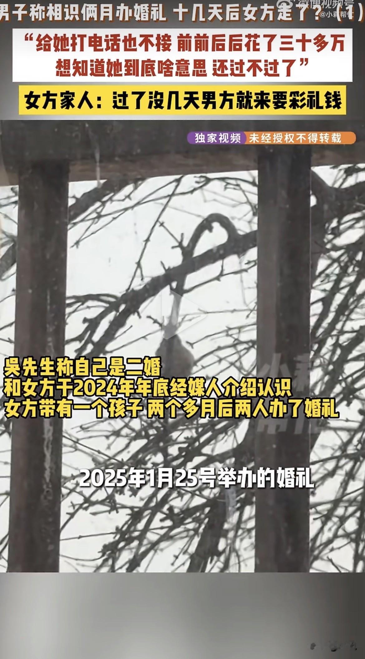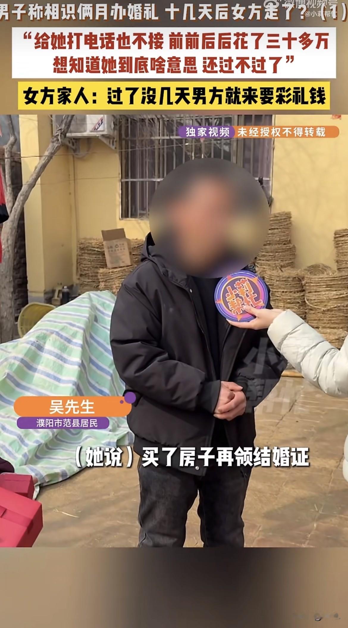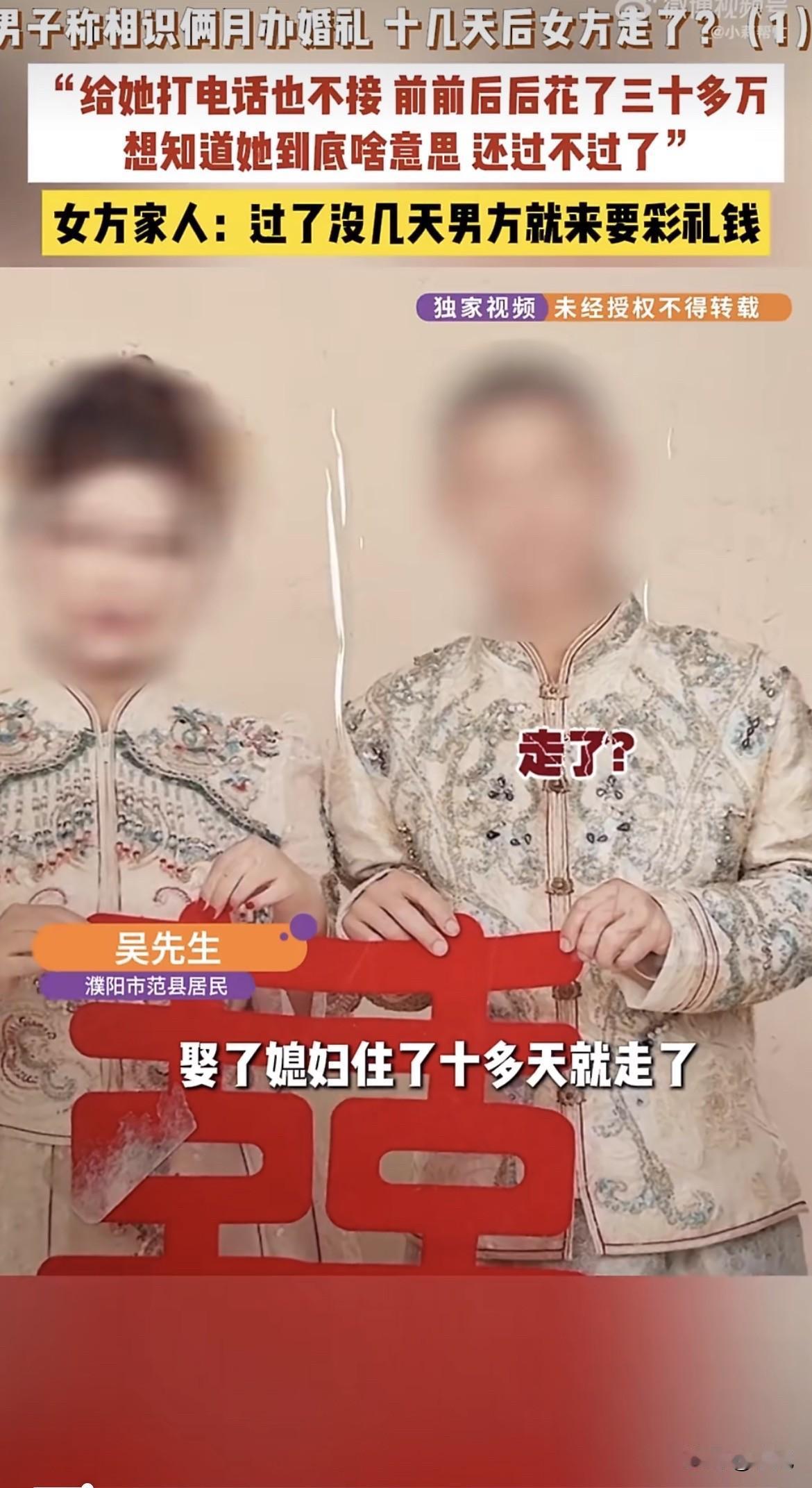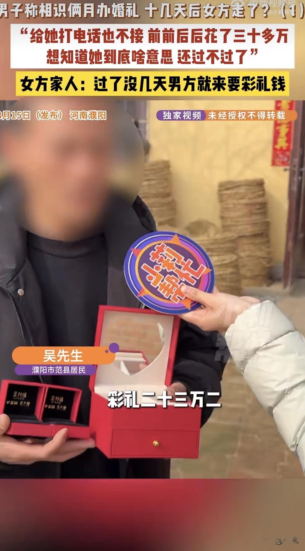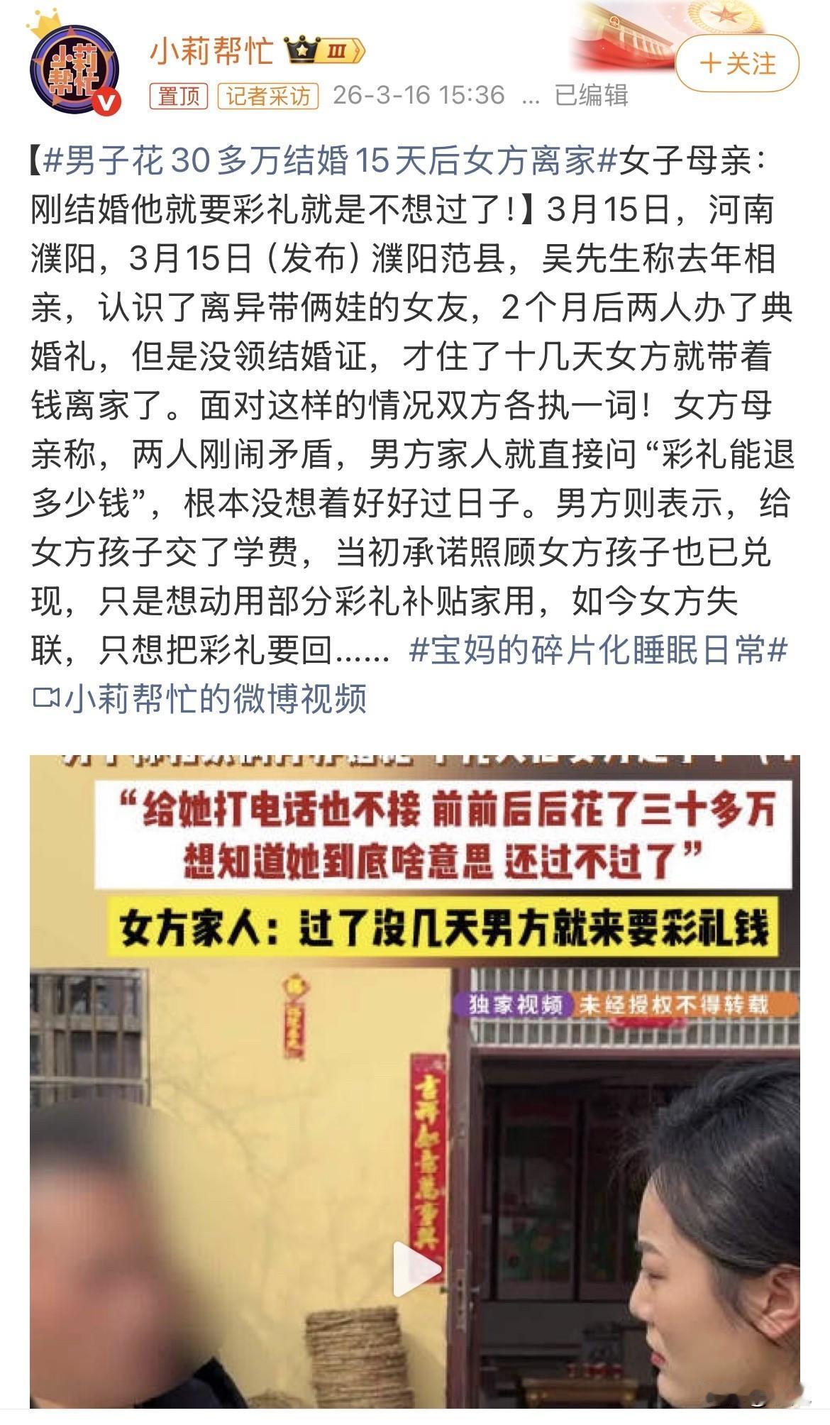 河南濮阳,范县,一个男的三十多了,经人介绍认识个女的。女的离过婚,带着俩孩子。男的家里条件一般,但为了娶媳妇,前前后后花了三十多万。 钱花了,婚礼也办了,没领证。女的带着孩子住进来,前后十五天,人没了。 男的现在到处找人,说我不图别的,就想把彩礼要回来。给女方孩子交的学费,当初承诺照顾她们娘仨,他都做到了。他就是想动一笔彩礼钱,拿来补贴家用,结果人直接失联。 女方母亲不干了。老太太对着镜头说,俩人刚拌几句嘴,男方家里张嘴就问“彩礼能退多少钱”,这根本就不是过日子的人。在她看来,刚结婚就算计彩礼,这婚结得有什么意思? 这话听起来都有理。 男的觉得,我钱花了几十万,你家孩子学费我掏的,住的房子我家的,我动用自己的钱都不行?女的觉得,刚进门就算账,往后日子还怎么过? 问题就出在这儿。两个月相亲认识,十五天同居,三十多万扔进去,最后剩下一句“你不想过”和一句“你算计我”。 这事要往深了看,其实不是这俩人有多坏,是这种婚姻模式本身就烂了根。 先说男的这边。三十多万,在河南农村什么概念?一个普通农户,种地加打工,攒十年未必能攒出来。这钱怎么来的?借的。借完谁还?爹妈还。儿子结了婚,老子背了债。这是当下农村最常见的“一人结婚,全家举债”。 男的为什么急着要动用彩礼钱补贴家用?因为他家底已经被掏空了。婚礼办完,家里可能连买种子的钱都没了。他以为媳妇娶进门,钱就是自家的,拿一点出来周转,天经地义。 但他忘了一件事。这笔钱在女方眼里,不叫“共同财产”,叫“保障”。 女的离异带俩娃,二婚进别人家门,她比谁都清楚自己的处境。三十万彩礼在她手里,不是钱,是底气。是她万一被扫地出门时,能带着孩子活下去的命。男的刚结婚就伸手要这笔钱,在她看来,跟要她的命没区别。 这就是死结。 男的觉得,人都是我的了,钱当然也是我的。女的觉得,钱在我手里,人才是我的。俩人睡一张床,算的却是两本账。 再看这十五天。女的带俩孩子住进来,这哪是新婚?这是直接进入柴米油盐。俩孩子不是男方亲生的,叫爸爸叫不出口,男的看孩子也别扭。加上钱的矛盾,一点小事就能炸。 拌几句嘴,正常。不正常的是,拌完嘴男方家第一反应是问“彩礼退多少”。这说明什么?说明从一开始,这家人的神经就绷在钱上,不是在过日子。女的感受不到温度,只有被算计的寒意。 女的走了。带钱走的。 现在这事闹到网上,双方各执一词。但法院判这类案子,有个不成文的规矩:没领证,共同生活时间短,彩礼要退。 濮阳当地法院刚判过一个类似的。俩人办了婚礼没领证,同居两个月散伙,彩礼十四万,法院判退七万。理由很直接:共同生活时间短,没领证,但女方确实买了嫁妆、付出过成本,不能全额退。 按这个标准,吴先生这三十多万,能退回来一半都算好的。 但钱能算清,账算不清。 那三十万是怎么来的?是男方父母把棺材本掏出来,又借了一圈凑的。是女方拿命换的,她离过一次婚,带着俩孩子,这三十万是她第三次投胎的敲门砖。这钱上面,沾着两家人一辈子的血汗。 这种婚姻,从一开始就不是奔着爱情去的,是奔着“解决单身”去的。男的年纪大了,家里催,娶个离异的也行。女的有孩子要养,得找个人托底。俩人见几面,条件谈拢,彩礼到位,直接进洞房。 这不是结婚,是搭伙。是拿三十万买一个“有老婆”的身份,是拿自己和孩子当筹码,换一张长期饭票。 这种模式,能不出事吗? 濮阳当地政府其实早就注意到这个问题了。这几年一直在搞移风易俗,提倡彩礼不超六万,甚至跟银行搞“新风贷”,只要婚事简办,就给低息贷款支持创业。目的是什么?就是不让彩礼成为买卖婚姻的筹码。 但上有政策,下有对策。六万不够?那就加改口费、加离娘钱、加各种名目。总之,少一分都不行。 为什么不行?因为农村男多女少,女的稀缺。数据显示,适婚男女比例大概129比100,男的比女的多出来将近三千万。女的往城里走,留在村里的男的,想娶媳妇,只能拿钱砸。谁出价高,谁带走。 这是一场拍卖会。女方是拍品,男方是竞拍者。成交价三十万,买回去用十五天,坏了,不给退。 男的冤吗?冤。女的有苦衷吗?有。但这事怪谁?怪不到具体的人头上。怪只怪,婚姻变成了一场买卖。买卖就得有契约,契约就有漏洞,有人钻漏洞,就有人血本无归。 吴先生现在只想把彩礼要回来。但要回来之后呢?他还能再凑三十万娶下一个吗?下一个能住够一个月吗? 女的带着钱走了。她还能找到下一个愿意出三十万接盘的吗?找到了,能过多久? 都是输家。只有这十五天是真的。 来源:小莉帮忙