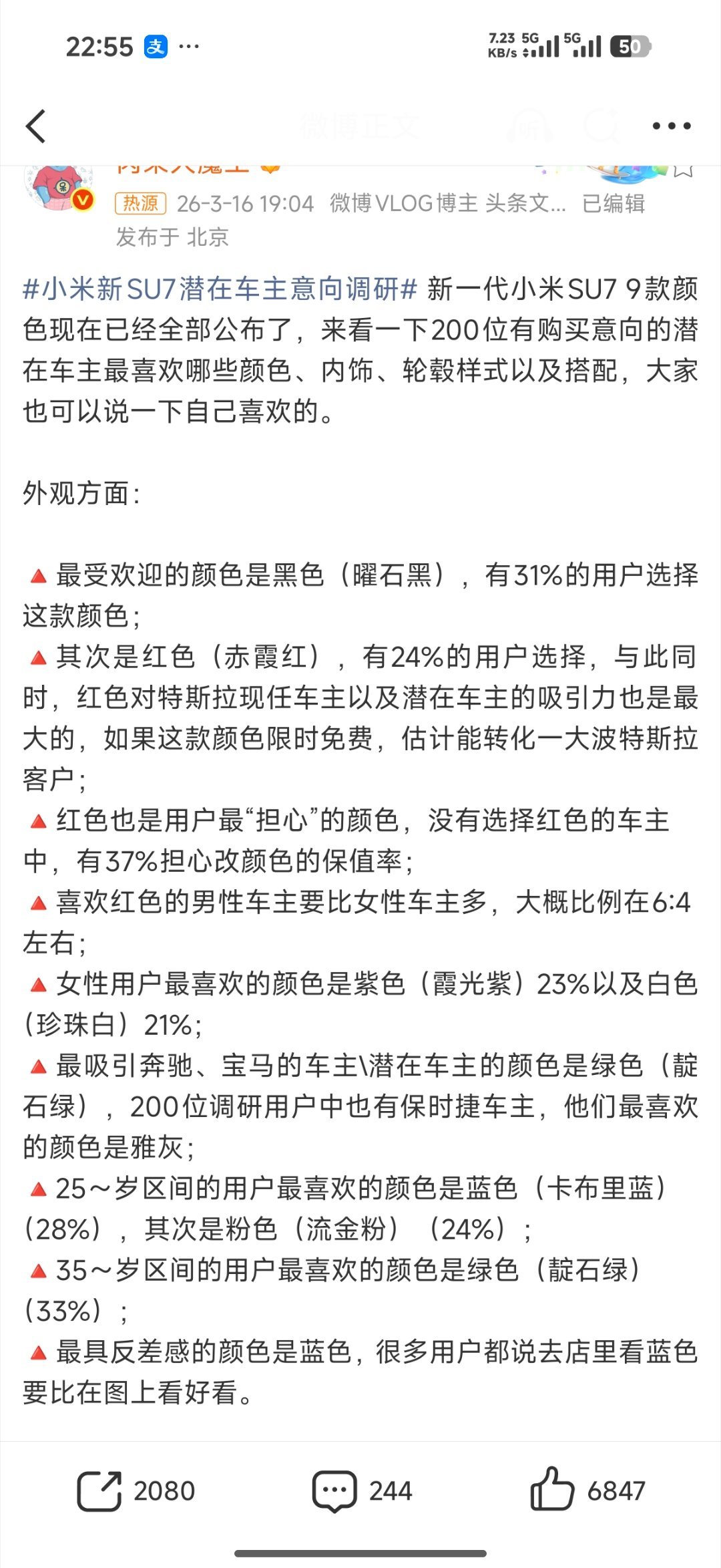 红色(赤霞红)的双刃剑效应: 24%的选择率证明其吸引力巨大,特别是对特斯拉车主的转化潜力。但37%的“担心改色保值率”也说明用户非常务实。这提示小米在营销红色时,除了强调激情,可能需要配套推出官方改色膜或保值服务来消除顾虑。