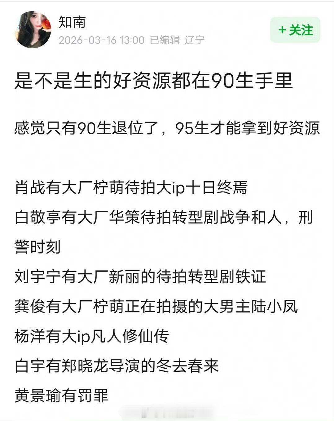 网友说剧圈好资源都在90生手里,导致大部分95生只能在古偶现偶圈打转。。。这么看90🥜都稳稳转型了,95还是古偶为主