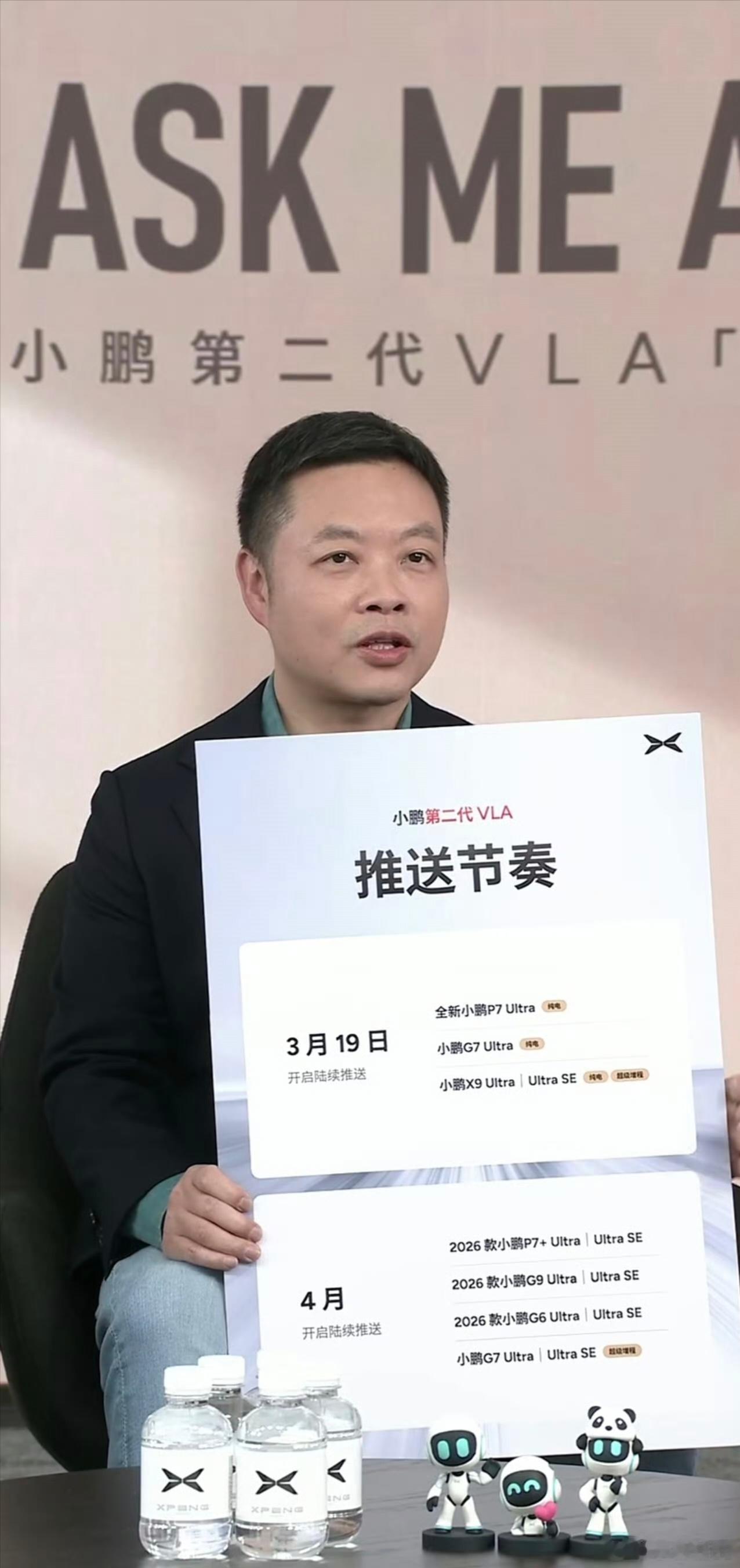 何小鹏直播第二代VLA推送刚在何小鹏直播间扒清楚了第二代VLA的推送节奏,整理给各位鹏友啦!3月19日起陆续推送:- 全新小鹏P7 Ultra(纯电)- 小鹏G7 Ultra(纯电)- 小鹏X9 Ultra / Ultra SE(纯电/超级增程)4月起陆续推送:- 2026款小鹏P7+ Ultra / Ultra SE- 2026款小鹏G9 Ultra / Ultra SE- 2026款小鹏G6 Ultra / Ultra SE- 小鹏G7 Ultra / Ultra SE(超级增程)