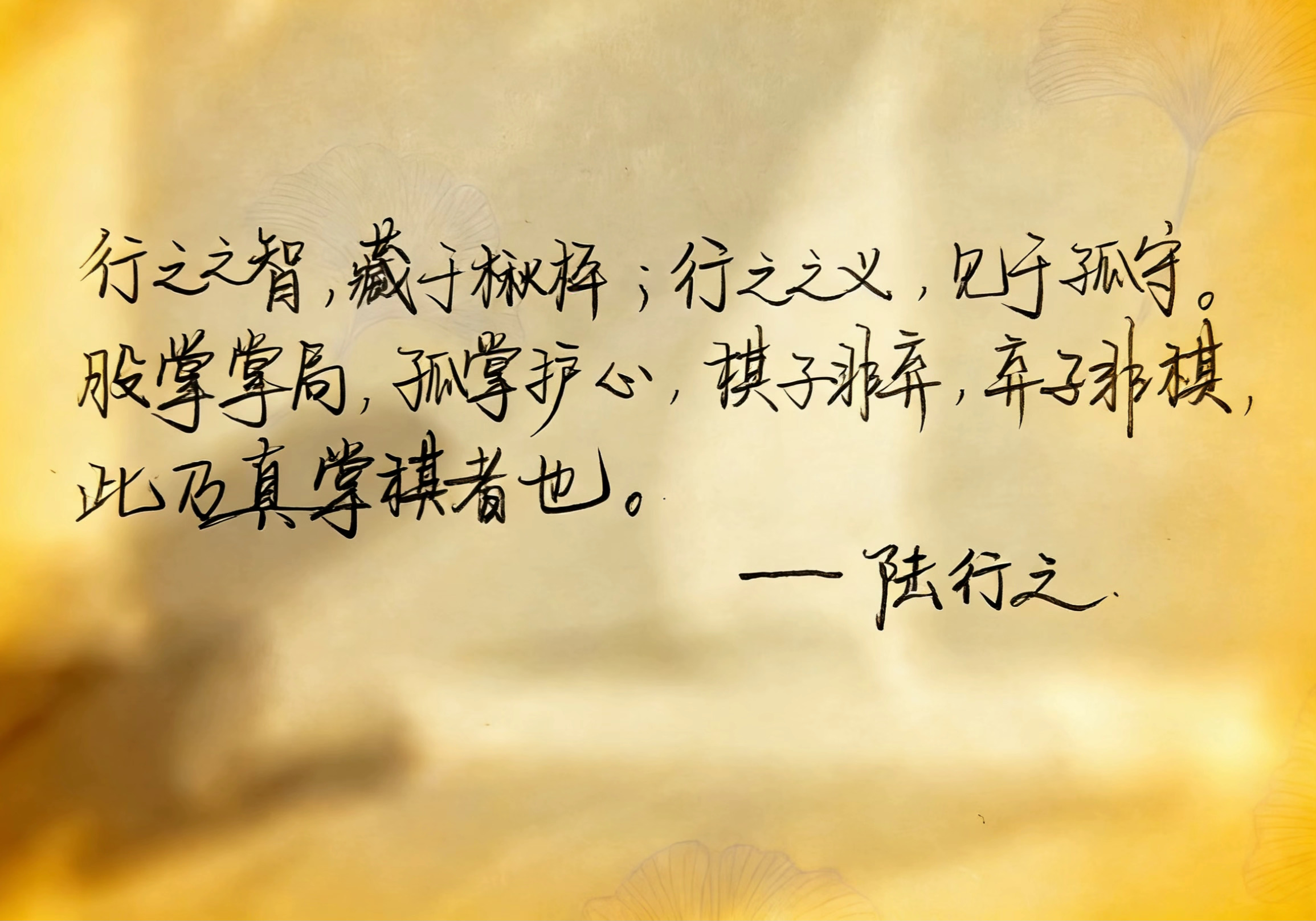 “行之之智,藏于楸枰;行之之义,见于孤守。股掌掌局,孤掌护心,棋子非弃,弃子非棋,此乃真掌棋者也。”