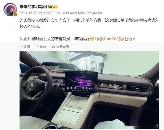 博主 未来的学习笔记 曝光了鸿蒙智行问界 M6 的实车内饰图。他表示,新车相比之前的方案,确实用了很多心思去考虑年轻人的需求。
