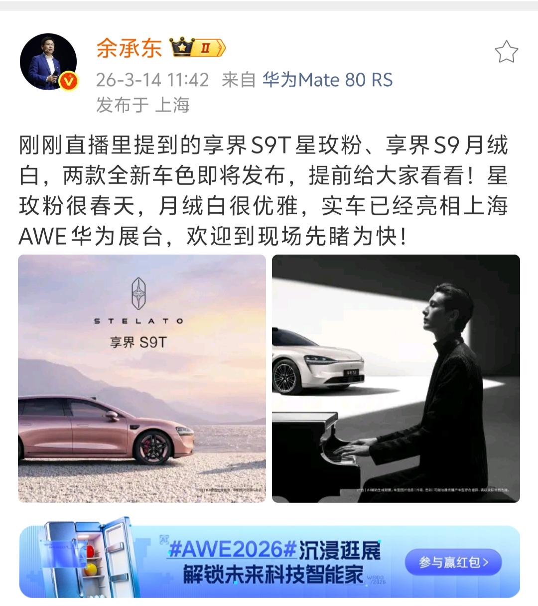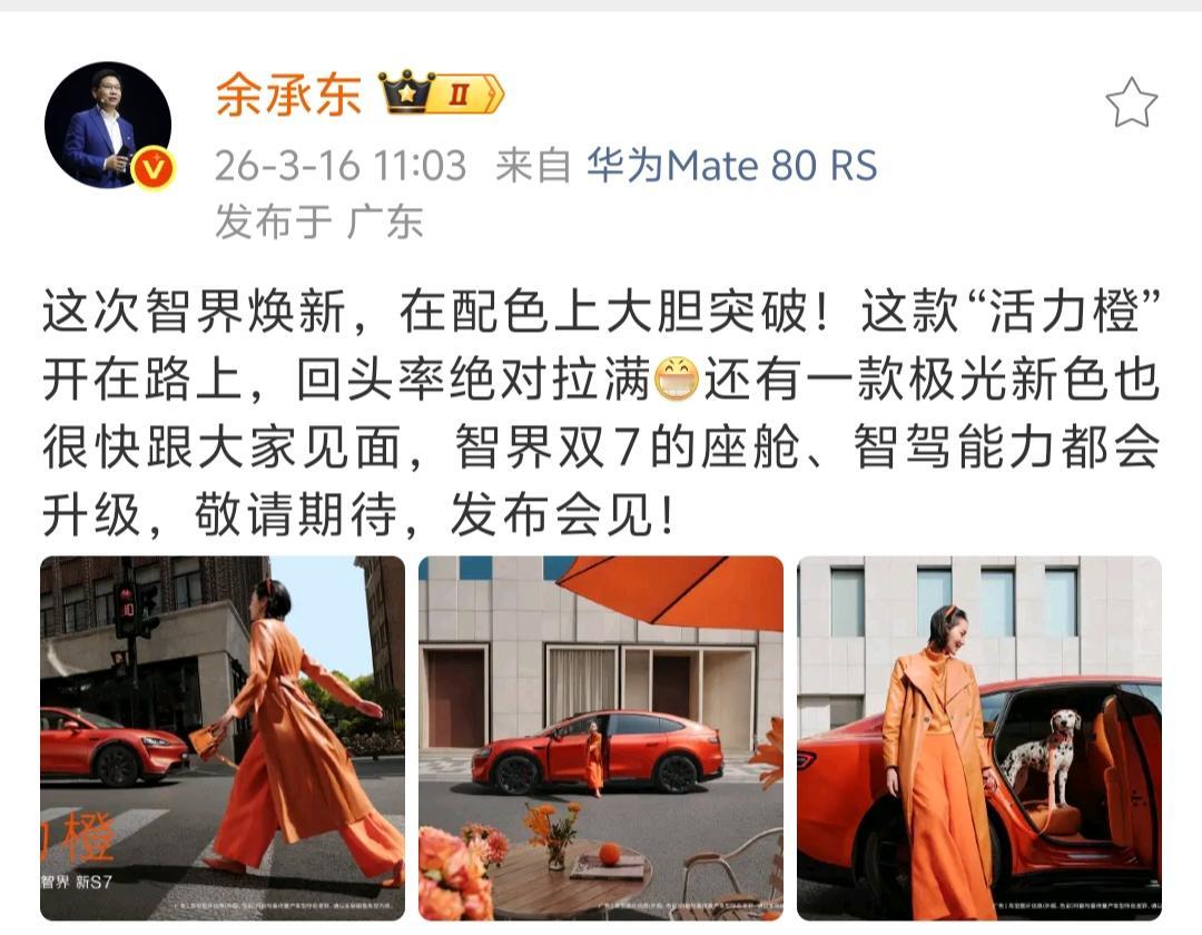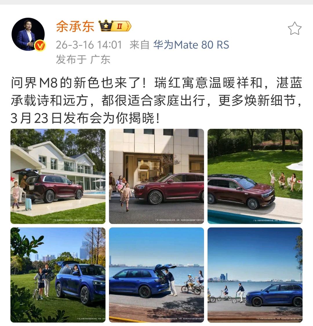 余承东亲自官宣了,华为23号的春季全场景新品发布会好多新车好啊,数了一下,一共有3款新车小定,6款在售车型焕新升级。 即将正式发布并开启小定的是问界M6、尚界Z7、尚界Z7T,焕新升级的是享界S9和S9T、智界S7和R7、问界M8、问界M7。 几天前,余承东就开始连续发了好多条微博为这批新车造势,并且对每个“界”都一视同仁,每家都专门发微博推介,也是操碎了心了。 3款新车同日小订,这在车圈已经是大动作了,还有6款在售的车型焕新,虽然不算改款,但增加新颜色的同时还将升级到896线激光雷达,也是够震撼了。 发布会一如既往的沿用华为风格,时间没有选在晚上黄金时段,反而安排在下午14:30,正是大家上班的时候,可见余总对这批新品的号召力真的很自信。华为入局智驾的鲶鱼效应 鸿蒙智行 余承东 问界 智界 享界