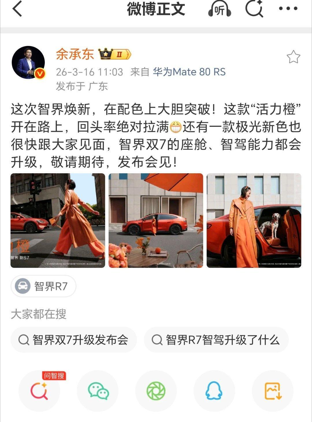 【华为余承东:智界“双 7”车型的座舱、智驾能力都会升级,还有一款极光新色】