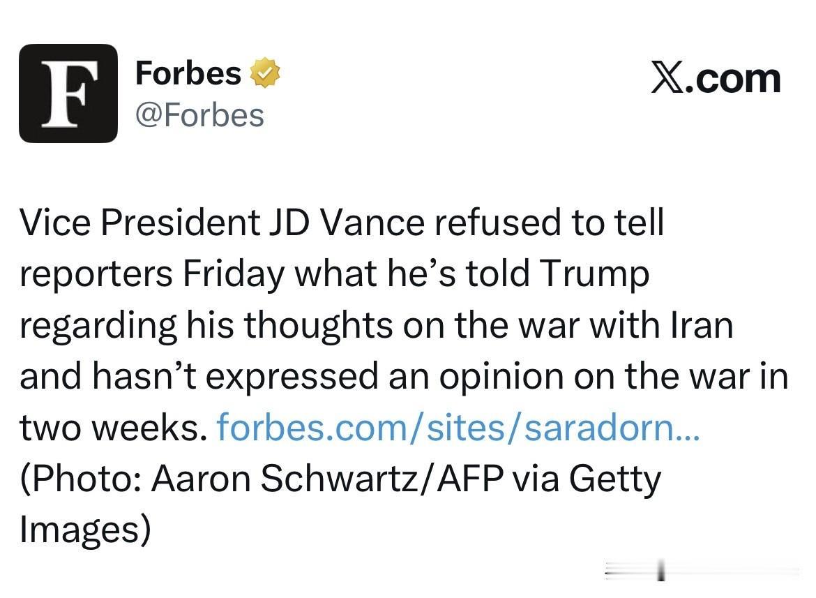 福布斯杂志报道:美国副总统万斯/JD Vance周五拒绝向记者透露,他是如何告诉总统特朗普他对与美以针对伊朗战争的看法。而且,万斯已经两周没有对针对美以对伊朗的战争发表任何评论和意见。 美国媒体都在报道,副总统万斯在对伊朗的轰炸问题上一直与特朗普存在分歧。