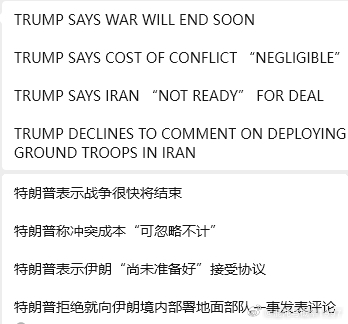 特朗普表示战争很快结束。他撑不住了,不想玩了资本市场这么大的利空都没跌下去,做空的空头那么多,一旦回补,那可是会涨不少。