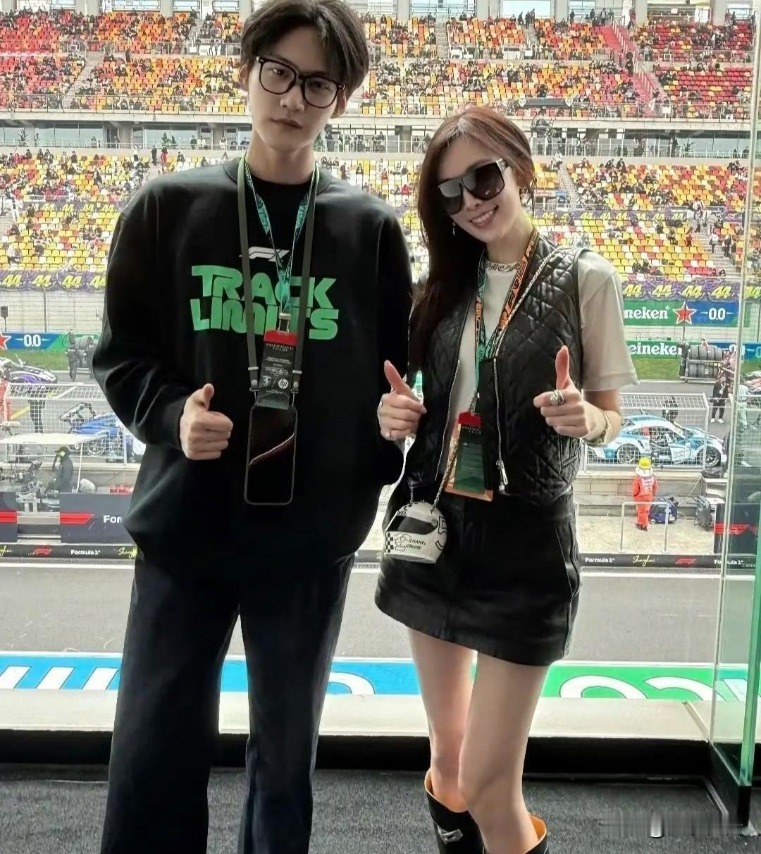 林太太陈若仪在上海观看F1赛事,与周柯宇、胡兵合影。她状态极佳,高挑美丽,曾是模