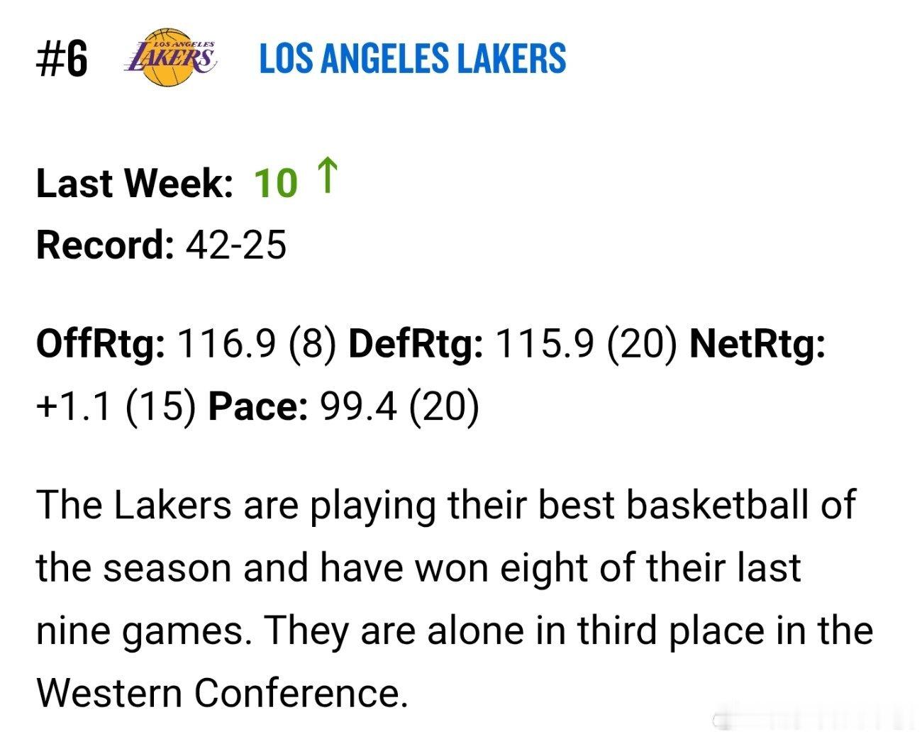 上周球队实力排行榜: 湖人上涨4位,已升至第6📈