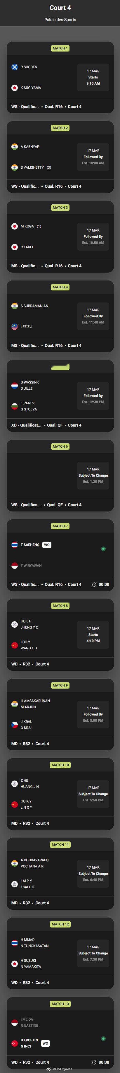 【奥尔良羽毛球大师赛首日赛程对阵】2026年奥尔良羽毛球大师赛羽联超级赛 3月17日,2026世界羽联超级300奥尔良大师赛将在法国奥尔良揭幕,首日比赛将于北京时间16时打响,国羽赛程对阵如下,完全赛程对阵见图:男单资格赛首轮:朱轩辰vs卡西克扬-普里亚(荷兰)胡哲安vs霍尔姆(丹麦)董天尧vs范德尔森(比利时)男双:胡珂源/林祥毅vs何志伟/黄睿璿(中国台北)女双:罗意/王汀戈vs胡绫芳/郑宇倢(中国台北)鲍骊婧/罗徐敏vs张净惠/杨景惇(中国台北)