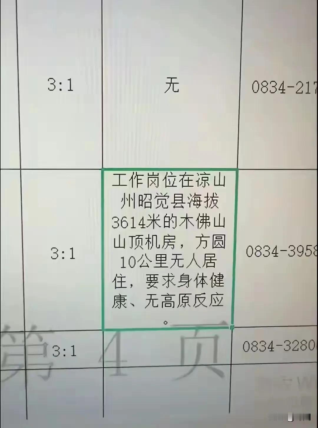 四川凉山州广电事业编制招聘“孤独勇士”,网传年薪到手可达14万,还有高额的五险一金和各种福利。3月15日,四川省凉山州地区公开招聘事业单位编制工作人员,其中一条引起网友热议,纷纷表示愿意一试。 原文是:凉山州木佛山广播电视转播台招聘“广播电视传输覆盖”岗位招聘1人。要求34岁以下、本科以上学历,备注特别信息“工作岗位在凉山州昭觉县海拔3614米的木佛山山顶机房,方圆10公里无人居住,要求身体健康、无高原反应”。 工作内容主要就是待在途中的山顶机房内部,维护系统设备稳定正常运行,有故障就主动维修,修不好就报告上级派人处理。工作时间是待一周放假一周,后期可能会调整安排到市州城内工作,上班时专车接送,从西昌市区驻地路程4小时。 网传该岗位的基础工资+绩效+津贴能够达到9000元/月,属于凉山州事业单位专技岗/管理岗标准,还有 ​额外第四档高海拔补贴1000元/月,同时年终奖会有2个月工资左右,更有事业单位丰厚的五险一金和各种福利活动。 网友们表示简直是社恐人专门岗位,不用天天被领导呼来唤去开会写报告,也不用被拉去应酬喝酒按摩,想睡就睡想玩就玩。就是身体一定要健康,普通人在高海拔地区感冒不得,同时还得自己会做饭,因为这里啥都没有,所有工资可以存下来。 西昌广电招聘“孤勇者”传年薪近20万 西昌广电招聘片山区机房运维人员 西昌招聘事业编方圆10公里内无人无户