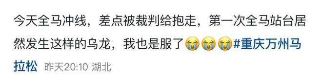 官方称万州马拉松事故为裁判误判【重庆万州马拉松乌龙事故引争议:冠军选手冲线时被拦停并强行带离赛道,官方称裁判因下雨误判,已致歉;选手本人赛后发文】冠军冲线被拦截马拉松组委会已致歉据大风新闻报道:3月15日,在重庆万州举办的2026重庆万州环湖马拉松终点处,男子全程马拉松冠军选手冲刺时遭遇意外插曲,被现场工作人员拦停并带离赛道,引发广泛关注。