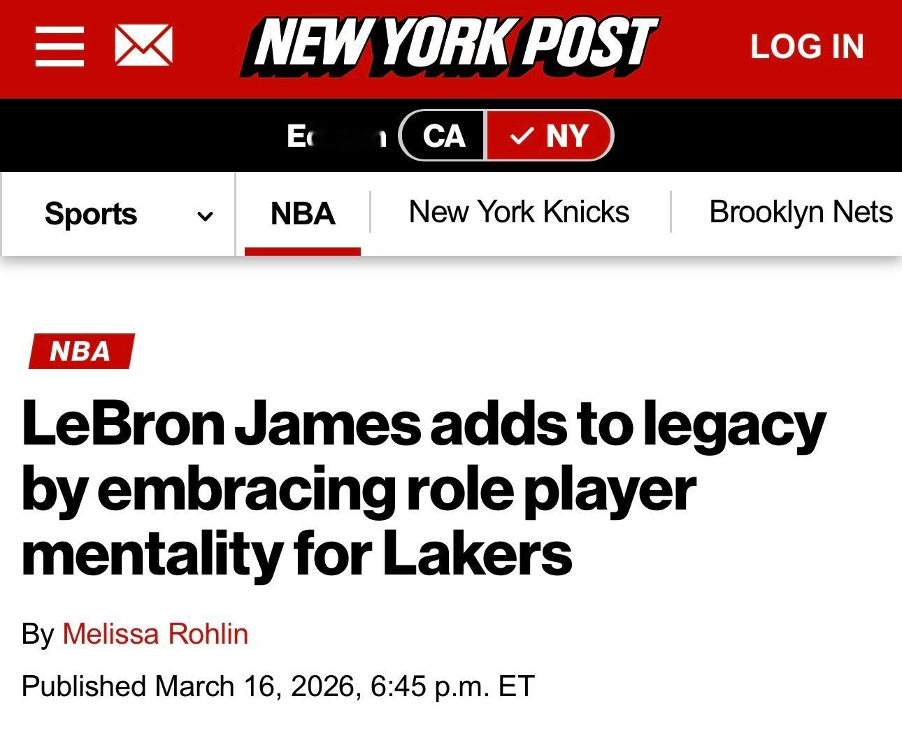 纽约邮报记者Melissa Rohlin撰文:勒布朗·詹姆斯甘当湖人角色球员,再度升华传奇生涯!