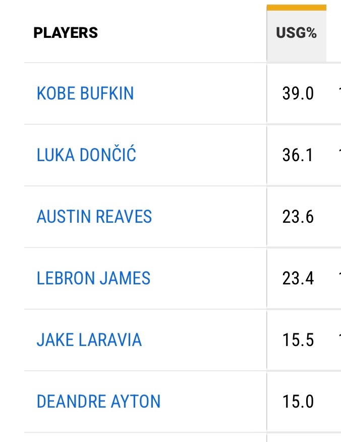 过去9场比赛,湖人8胜1负,在此期间,詹姆斯的USG%队内第三。