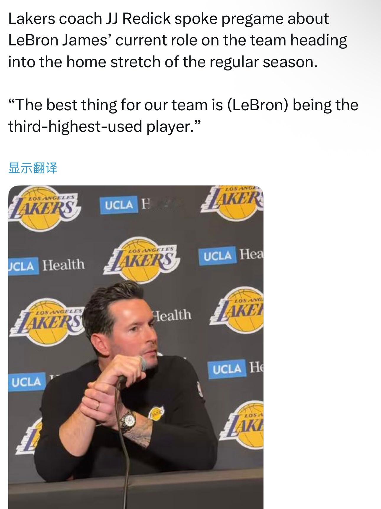 雷迪克谈及詹姆斯在球队中的当前定位:“对湖人而言,最理想的情况是让(勒布朗)成为
