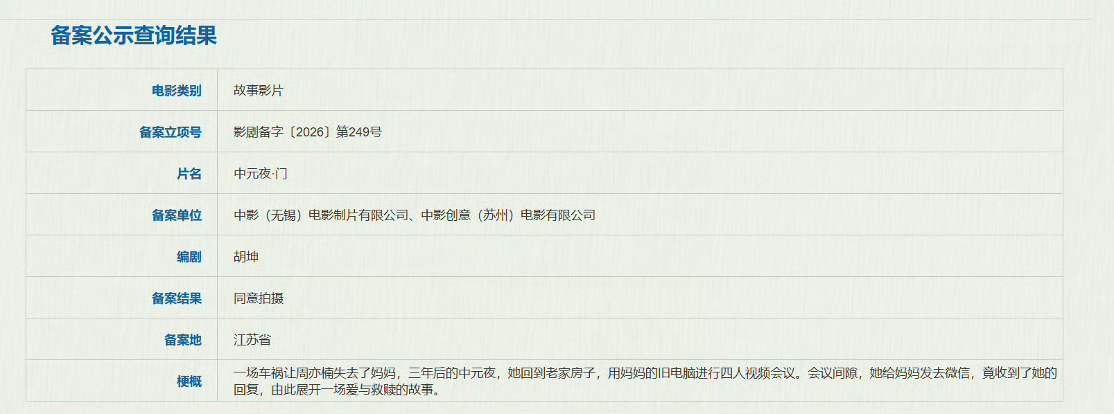 电影《中元夜·门》备案备案单位中影(无锡)电影制片有限公司、中影创意(苏州)电影有限公司。梗概:一场车祸让周亦楠失去了妈妈,三年后的中元夜,她回到老家房子,用妈妈的旧电脑进行四人视频会议。会议间隙,她给妈妈发去微信,竟收到了她的回复,由此展开一场爱与救赎的故事。