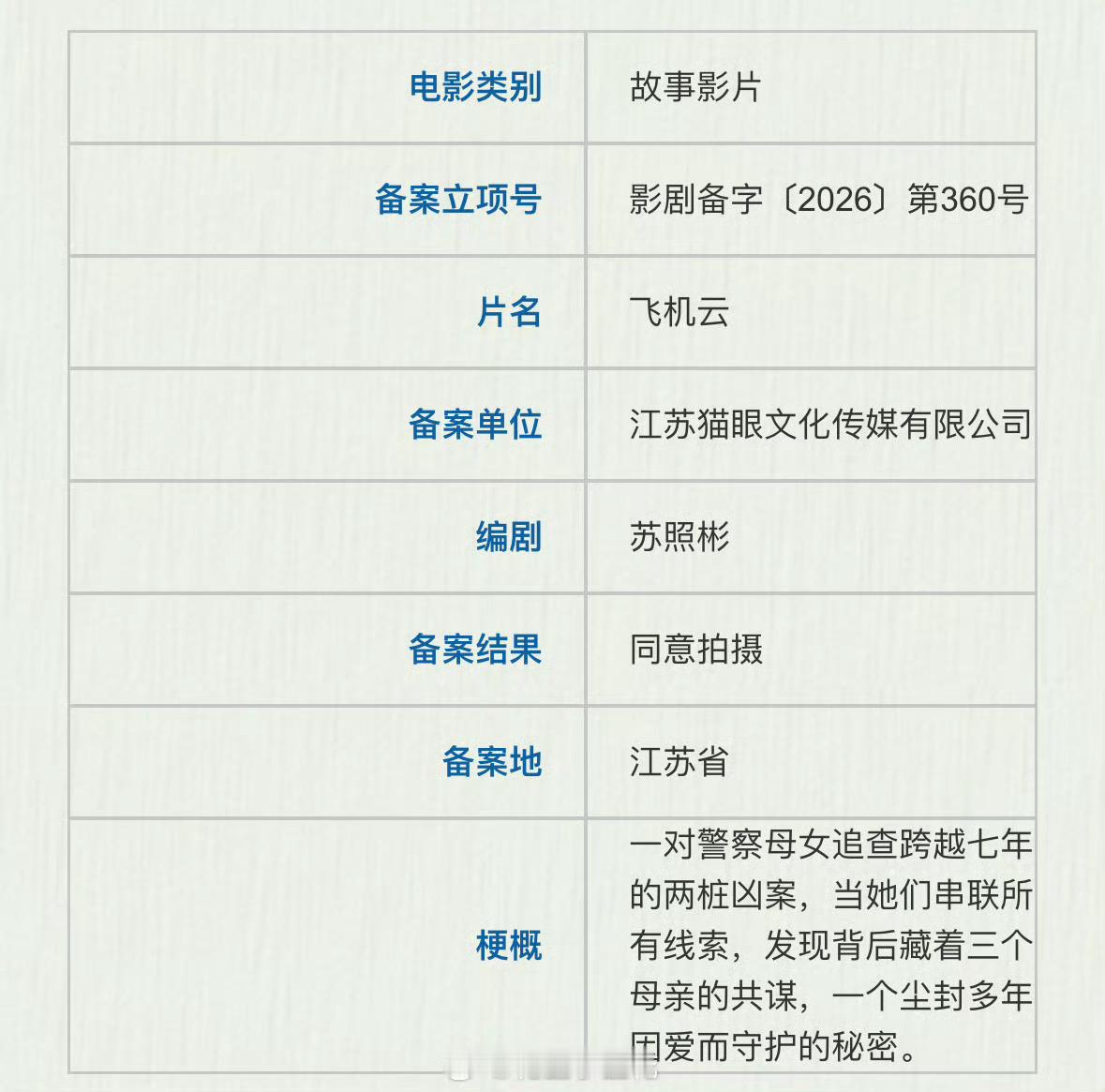 电影《飞机云》备案出品:猫眼娱乐编剧:苏照彬《镖人》《双瞳》《剑雨》电影飞机云 梗概:一对警察母女追查跨越七年的两桩凶案,当她们串联所有线索,发现背后藏着三个母亲的共谋,一个尘封多年因爱而守护的秘密。