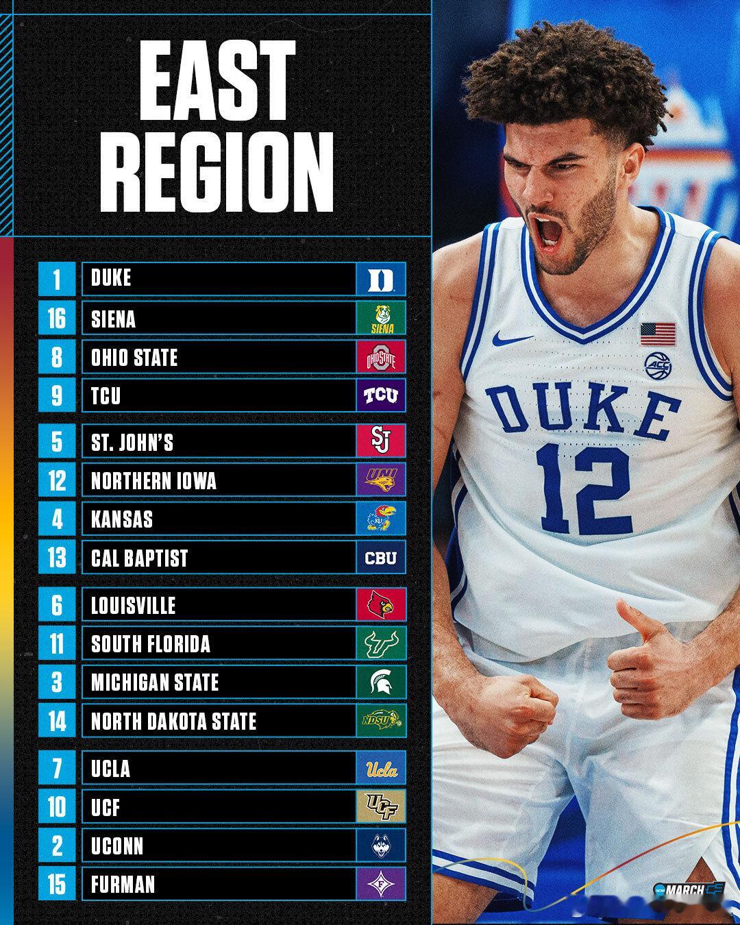 NCAA疯狂三月68支球队及种子分区出炉,总头号种子为杜克大学(卡梅伦-布泽尔领衔),总战绩32胜2负