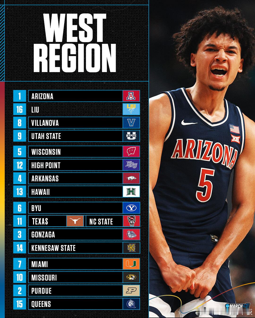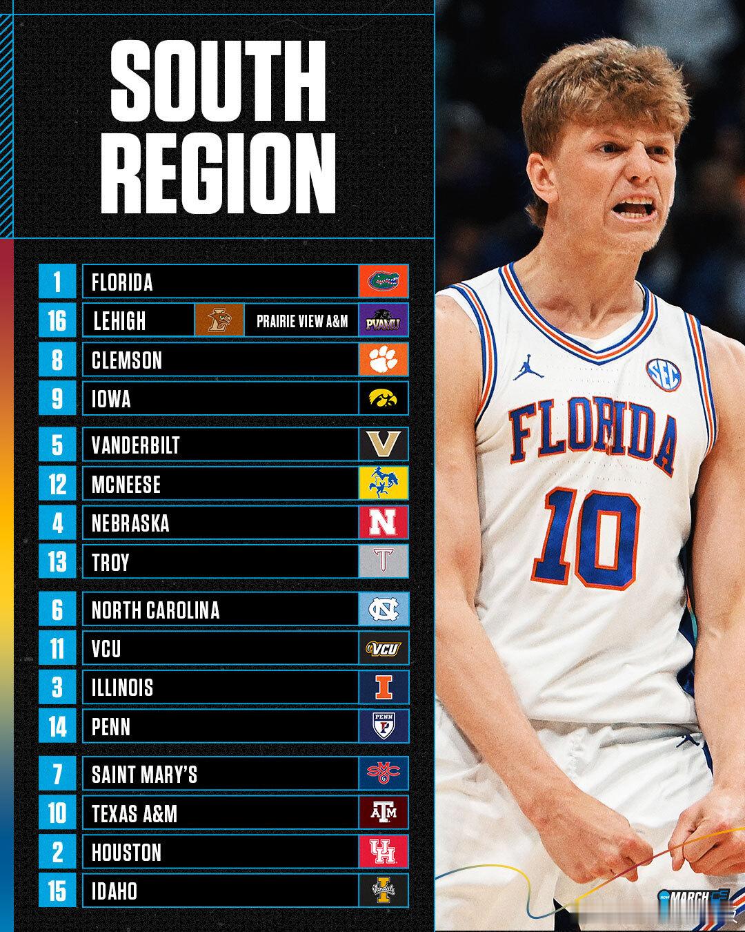 东区第一:杜克大学西区第一:亚利桑那大学中西部第一:密歇根大学南区第一:佛罗里达大学