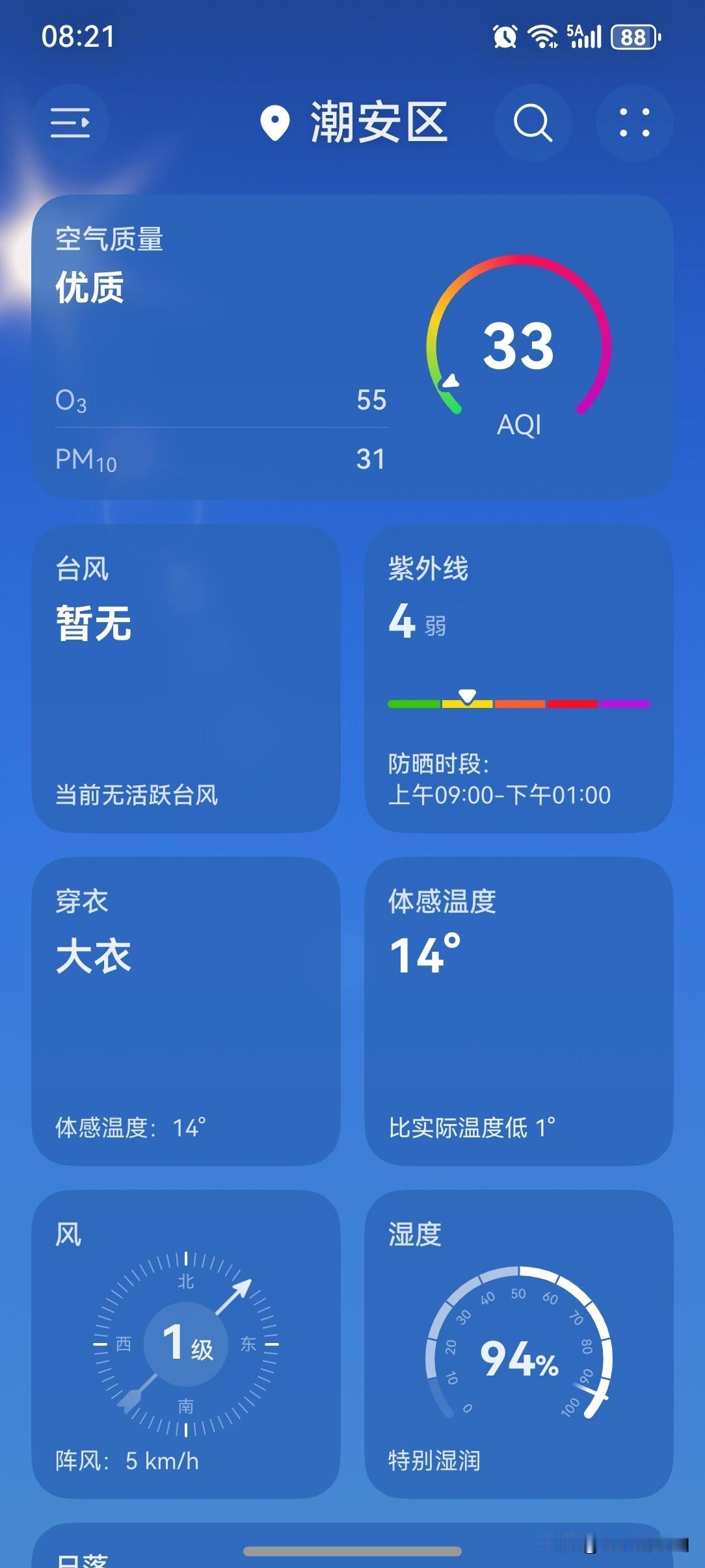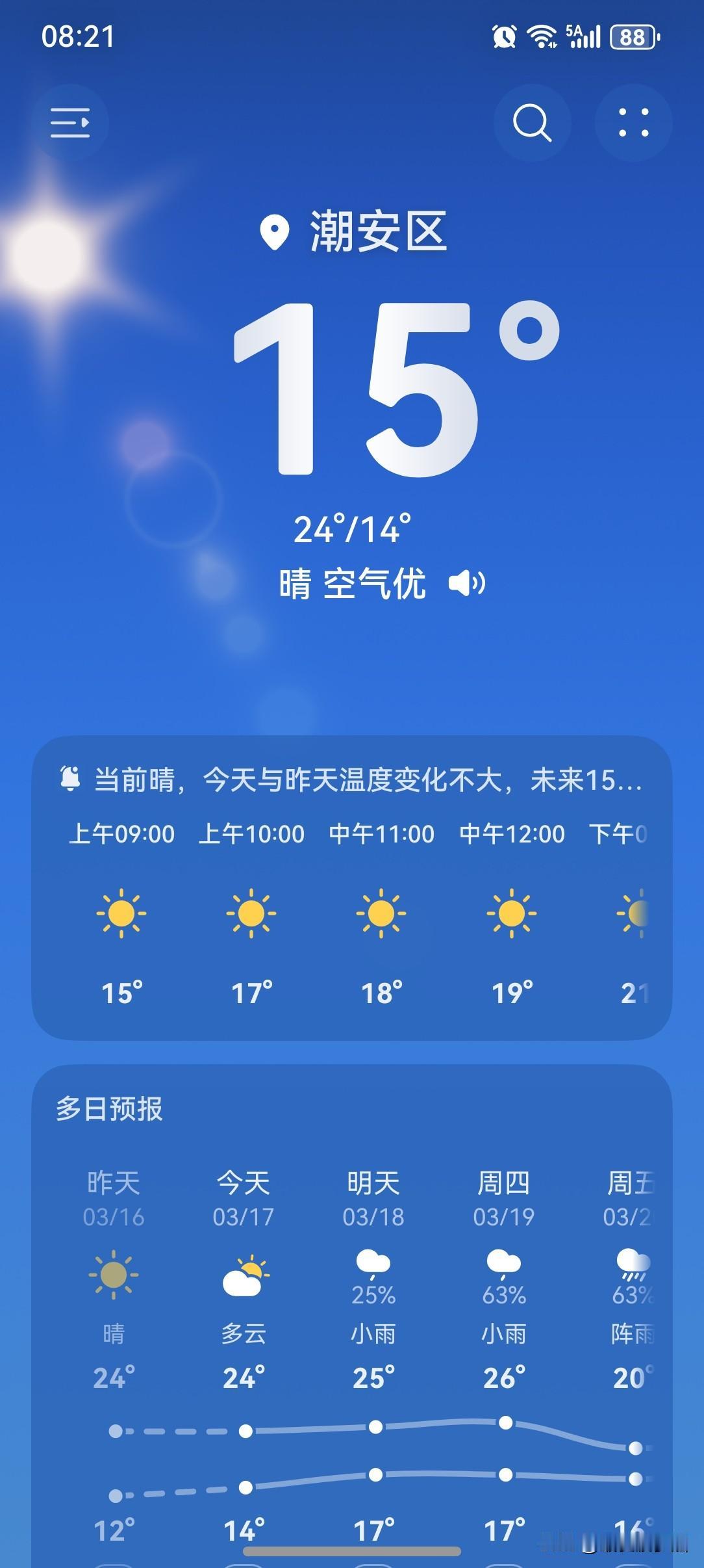 广东天气画风有变,云量渐多! 17~19日,受偏南气流影响,广东大部云量增多,早晨有轻雾,部分市县有零星小雨,大部气温总体趋于回升。 今天(17日),潮州喜提一个多云天气,气温14~24℃,此刻气温15℃,体感温度14℃。 今天的气温跟昨天差不多,依然暖和,全天最高气温将达24℃,最低气温也有14℃,冷不冷一点呢!不错不错! 一起来看看今天的天空吧!虽说是多云天气,但天气画风与昨天极为相似,早上依然可见阳光,还蛮灿烂的呢!不过,春天的天气变化节奏比较快,还不知道一天要变多少回呢! 但就目前来看,这是还能白捡一天晴好天气的节奏啊!阳光如此灿烂,气温如此暖和,当真是个好天气啊! 今天的天气,从整体来讲,应该获得一个五星好评。 如此天气!元芳,你怎么看? [捂脸][我想静静][笑哭][大笑][捂脸][我想静静][笑哭][捂脸]