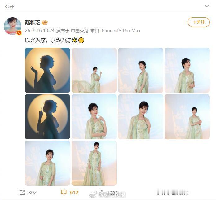 【赵雅芝光影十宫格】赵雅芝侧颜剪影 3月16日,晒出十宫格写真,她身穿淡青绿色改