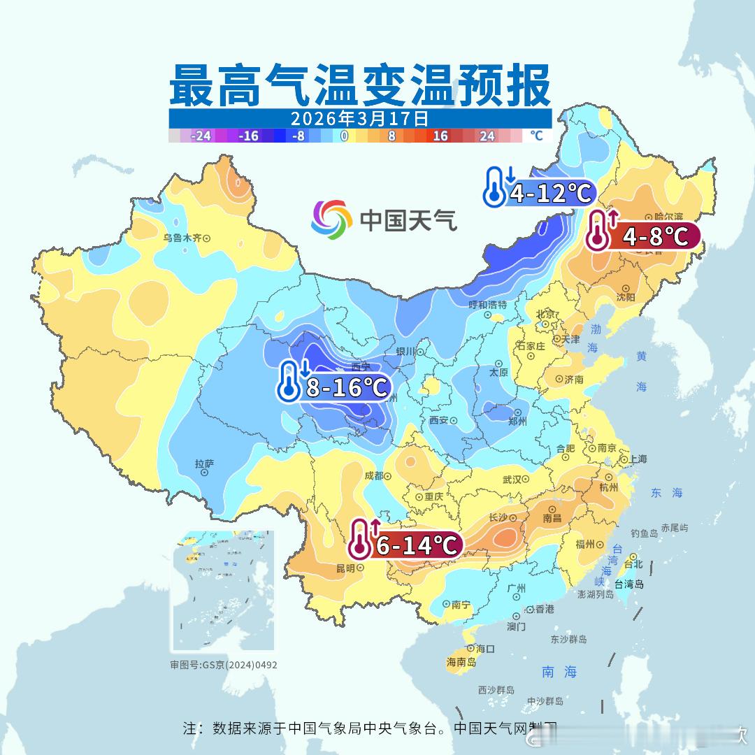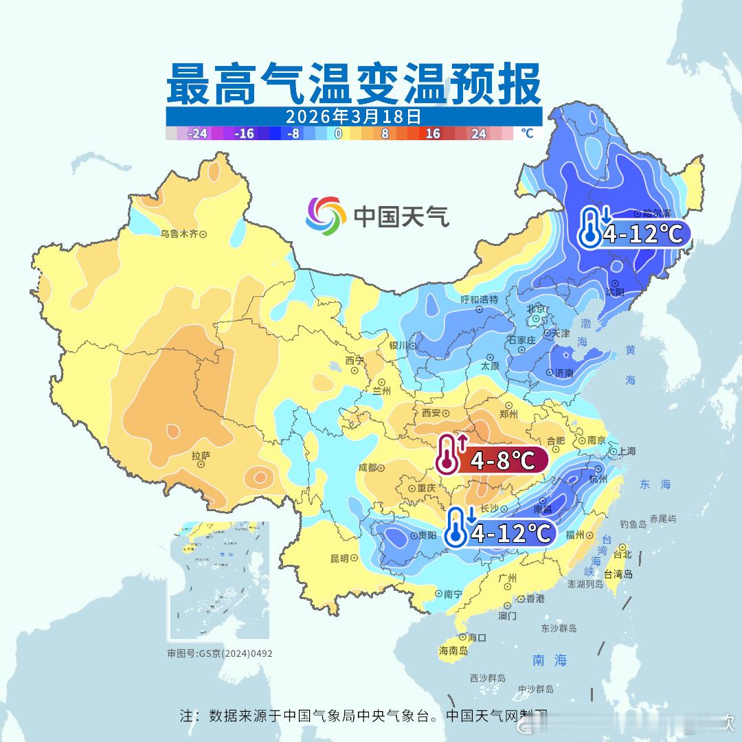 【冷空气】今后3天将有冷空气东移南下,影响我国北方多地到江南一带。而且叠加雨雪,最高气温的下降幅度会明显大于最低气温的降幅。今天青海东部和内蒙古中东部为核心降温区,部分站点降温会超过10℃。今天东北三省明显升温,但明天会大幅降温。另外明天冷空气南下后,江南多地也会降温。