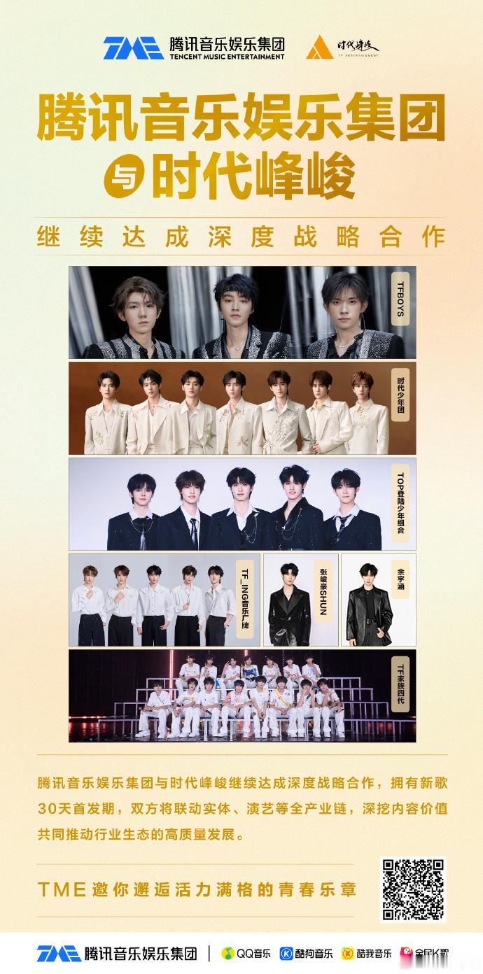 时代峰峻和TME继续深度合作 时代峰峻和TME继续深度战略合作~咱就是说以后新歌能不能多发! 从一代到四代、从团体到solo,未来共同见证艺人成长并深化音乐生态布局啦!
