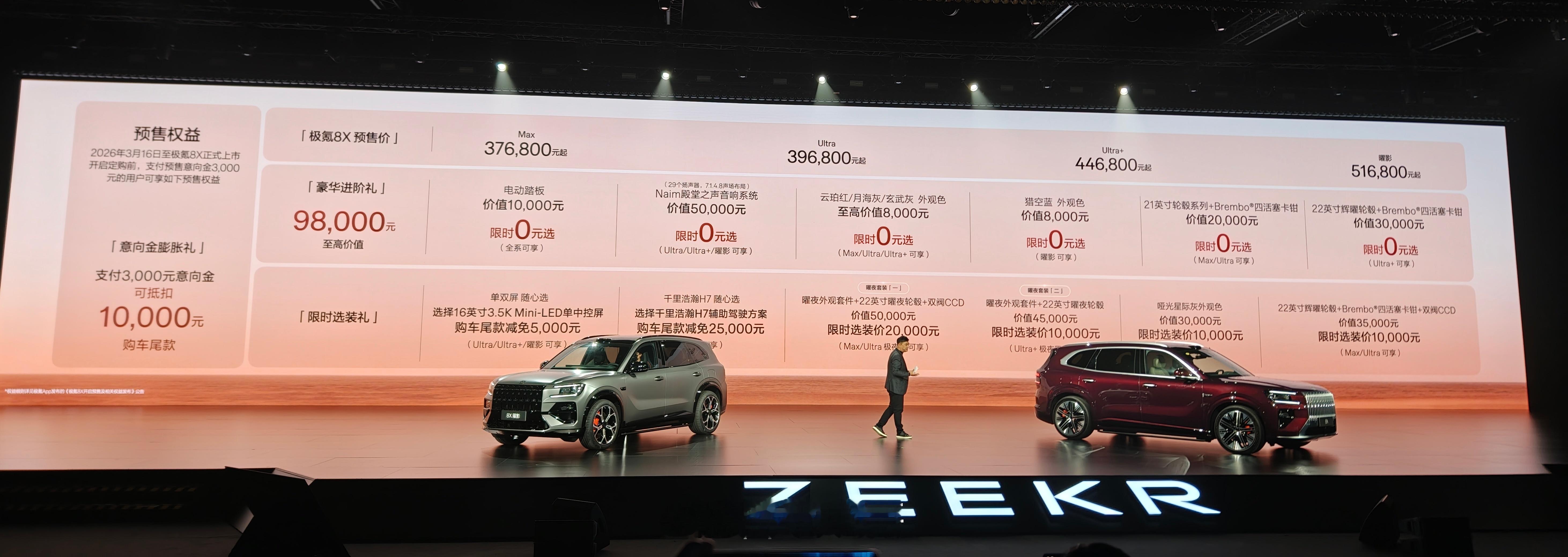 新车共推出4款车型,预售价区间为37.68-51.68万元。运动豪华风格的造型,加上这些这么顶的配置,开启预售之后38分钟内小订就突破10000台了。大家出手预订了吗?极氪8X大V聊车极氪8x新公路之王