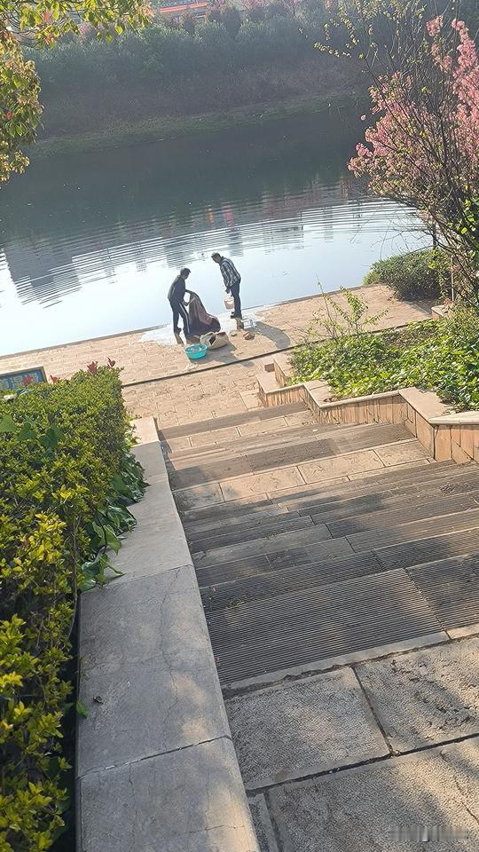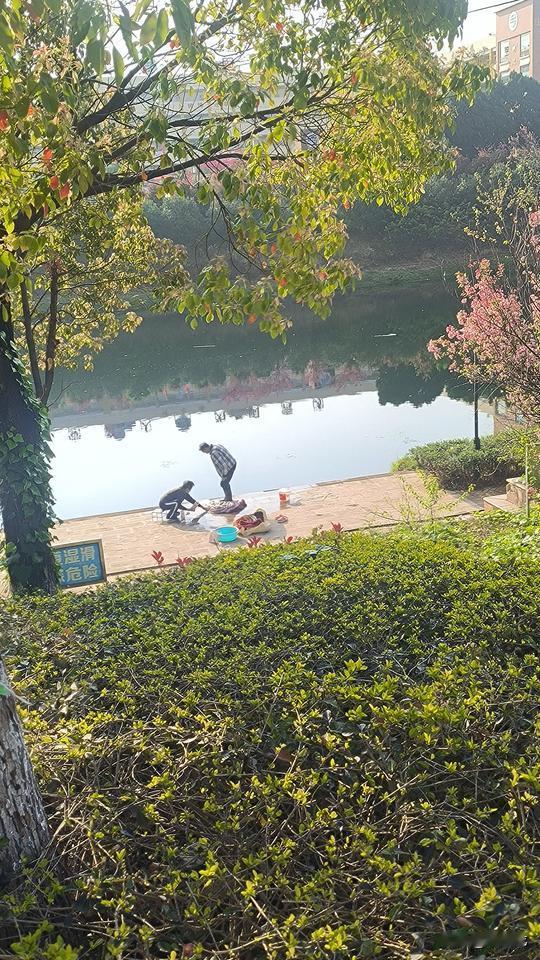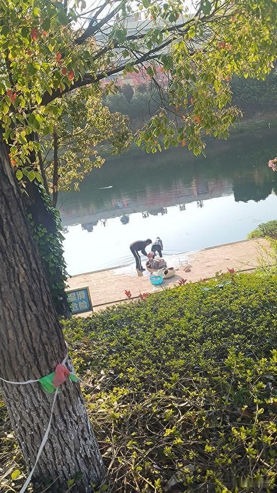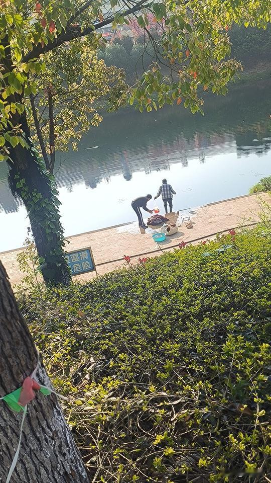 早上送完孩子,去南盘江边晨练时看到的一幕。 两个老人,推着人力三轮车,带着毛毯、衣服和鞋子来到河边洗涤。 他们应该是天刚亮就来了,我看鞋子都已经洗好晒在苗圃上。 南盘江水深不见底,堤岸上醒目地列着警示牌:严禁在水边嬉戏、游泳和垂钓。 老人用包装带子拴在水桶上,将水提了上来,在岸上将毛毯打湿,撒上洗衣粉和洗洁精,穿上水鞋站上去来回踩,反复踩。 洗涤得差不多了,就拿了走下台阶,蹲在河边漂洗。 岸边台阶石滑,他穿着水鞋,就这样蹲在水边,吃力地弯着腰漂洗。 他自己觉得无所谓,我却看得心都提到嗓子眼,一旦踩滑了或者用力过猛,摔到河里就危险了。 老人一辈子节约惯了,来河边洗无非就是为了省水,但这样做有非常大的隐患。 用得了几方水,最多省得下一二十块,可一旦出事,就有可能老命都要葬送掉。 真正出了事,河堤管理部门和水务局又要来背锅了。