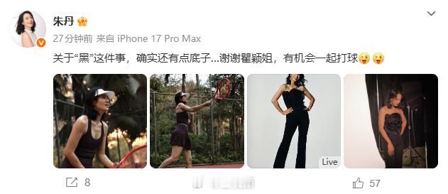 【朱丹回应被瞿颖说黑】朱丹晒黑肤色照片 晒照回应被调侃皮肤黑:关于“黑”这件事,确实还有点底子…谢谢瞿颖姐,有机会一起打球。朱丹晒出的几张照片中肤色都比较偏黑,但是一看就很健康的肤色~ 此前在《Papi热烈欢迎》中,说朱丹“特别黑”,笑称两人若比拼肤色会很有看点。因为瞿颖盒马的菠菜都标上英文了