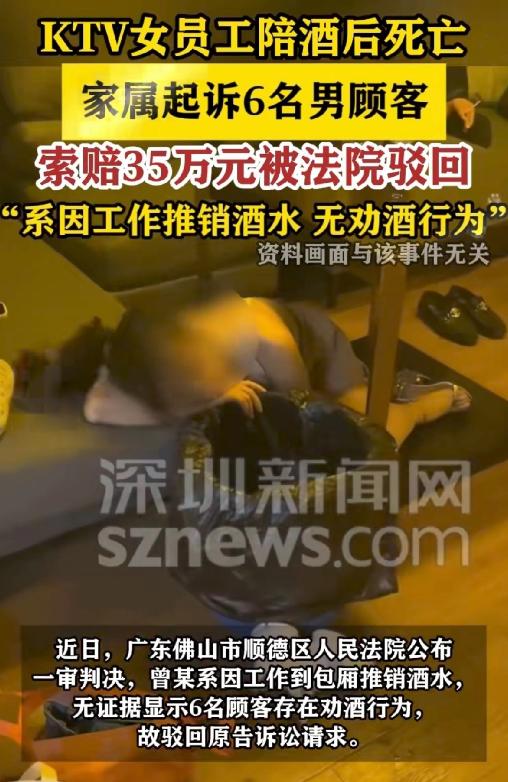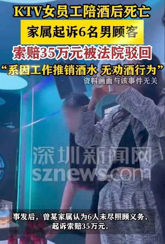 广东佛山,KTV女员工走进包厢给6名男顾客推销酒水,礼貌性的喝了几口后,便在包厢休息,次日凌晨一点多,酒局散场,男子们都各自回家,女子还待在包厢,不久后,保洁发现她一个人在包厢哭,但没敢管她,谁知下午5点多,有人发现女子竟然在包厢沙发上一动不动,不幸死亡,这下,女子家属不干了,他们认为,那6个男子没有尽到照顾义务,一纸诉状告上法庭,要求赔偿35万。 事情发生在2024年3月18号晚上,佛山一家KTV里,女员工曾某像往常一样上班,负责推销酒水,那天晚上,有6名男子结伴来KTV消费,开了V06包厢唱歌喝酒。 曾某走进包厢,按照行业惯例,礼貌性地陪这6名男顾客喝了几口酒,没再多停留,也没继续推销,就留在包厢里休息了。 等到第二天凌晨一点多,这6名男子的酒局散了,几个人各自回家,临走时看到曾某还在包厢里,状态看着也没什么异常,就没太在意,谁也没多想这一转身会是永别。 大概凌晨两点半,KTV的保洁人员进包厢打扫卫生,发现曾某一个人坐在沙发上哭,看着意识是清醒的,也没有明显的身体不适,保洁人员没敢上前多问,打扫完就离开了。 没人知道,当时的曾某心里藏着什么,也没人想到,这会是她最后一次有明显的状态反应,就这么一直到当天下午五点多,KTV工作人员才发现,曾某还躺在那个包厢的沙发上,一动不动,不管怎么呼喊推搡,都没有任何回应。 大家赶紧报警打120,可医护人员赶到后,当场就证实曾某已经死亡了,好好的人说没就没,曾某的家属彻底崩溃了,深陷丧亲之痛的他们,把所有的悲痛都转化成了怒火,直接盯上了当晚和曾某一起喝了几口酒的6名男顾客。 家属觉得,这6个人和曾某一起喝了酒,就算是共饮人,就有义务照顾好曾某,可他们却自顾自离开,没尽到照顾义务,才导致悲剧发生,家属觉得这6名男子有责任,于是一纸诉状把他们告上了法庭,要求6人连带赔偿35万元。 而这6名男顾客却觉得特别委屈,他们说自己只是来消费的,从来没有邀请曾某喝酒,更没有劝过她,离开时曾某状态正常,根本没必要承担赔偿责任。 当地法院的一审判决下来了,结果出乎很多人意料,法院驳回了曾某家属的全部诉讼请求,也就是说,这6名男顾客一分钱都不用赔。 可能有人会觉得不公平,人都死在包厢里了,怎么能一分不赔?其实法院判得很明白,没有证据证明这6名男子邀请曾某喝酒、劝过酒,他们和曾某只是消费与推销的关系,算不上法定的共饮人,自然没有照顾义务。 而且保洁凌晨看到曾某时,她还能哭泣,说明当时身体没有明显异常,6名男子离开时,根本不知道她会出意外,也没有放任她处于危险中的过错,更关键的是,目前没有证据证明曾某的死亡和当晚的酒局有直接关系。 这场官司结束了,可悲剧已经无法挽回,一个鲜活的生命就这样逝去,最难过的还是家属,其实这事也给所有人提了个醒,谋生不易,不管是做什么工作,都要守住自己的底线,别为了业绩勉强自己,健康和生命永远是最重要的。