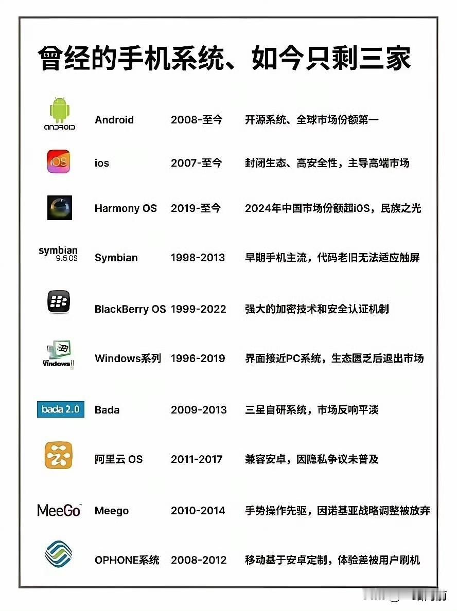 当年百花齐放的手机系统,为啥现在只剩三分天下? 翻看十年前的手机圈,那真是百家争鸣,百花齐放。当时除了咱们熟悉的系统,还有三星的Bada、诺基亚的Meego、黑莓的OS,甚至连索尼爱立信都有自己的AOSP定制系统,手机品牌和系统之间那是一场“神仙打架”。可没想到,短短几年时间,市场画风突变,现在基本成了iOS和安卓双雄并立,再加上华为鸿蒙的异军突起,稳稳守住了“三分天下”的局面。 为啥当年那么多特色系统,现在都没了踪影?参考第三方数据机构StatCounter的最新统计,2026年2月全球智能手机操作系统市场中,安卓以46.87%的份额高居第一,iOS紧随其后占比43.16%,两者合计占据全球超90%的市场份额。而曾经的老牌系统,除鸿蒙外,其余加起来的市场占比已不足2%。 这背后其实是技术门槛和生态建设的双重博弈。当年的Bada、Meego等系统,单看体验并不差,有的甚至在流畅度或特色功能上有亮点。但问题在于,做手机系统是个“烧钱又烧时间”的技术活。以安卓和iOS为例,它们背后有谷歌和苹果长达十几年的持续投入,不仅搭建了完善的开发者生态,还通过应用商店形成了闭环。反观一些小众系统,要么因为资金链断裂被迫停运,要么因为缺乏开发者支持,优质APP越来越少,消费者自然也就慢慢流失。 再看鸿蒙的崛起,就更能说明生态的重要性。作为后来者,鸿蒙依托华为的终端布局和全球开发者资源,快速搭建起自己的生态体系。据华为官方数据,截至2025年底,鸿蒙生态设备数量已突破9亿台,搭载鸿蒙系统的设备数持续增长,成功在双雄垄断的市场中,切出了属于自己的9.97%市场份额,成为全球第三大手机操作系统。 不过也有网友好奇:现在三分天下的格局,未来还会变吗?有人觉得安卓和iOS的生态壁垒太高,新系统很难突破;也有人看好鸿蒙的发展,认为依托万物互联的趋势,它未来有望进一步提升份额。还有人怀念当年的小众系统,觉得多一些选择才更有趣。
