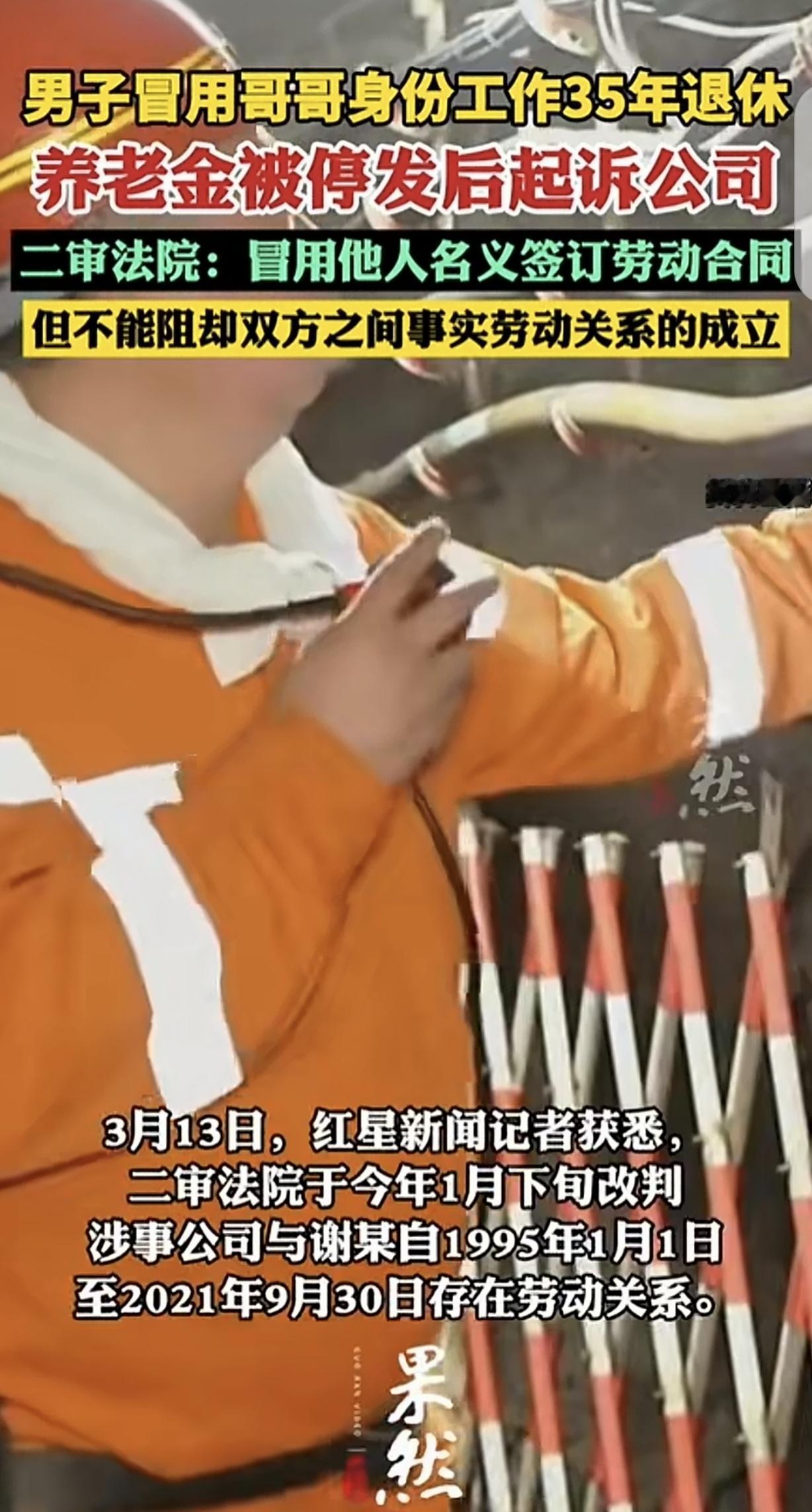 宁夏,哥哥犯罪蹲监狱,男子冒名顶替了哥哥的工作,一干就是35年,退休后,领了1年退休金,就被公司停发,男子申请劳动仲裁被驳回,他告上法院,要求确认自己与公司存在35年劳动关系,法院一审判决:存在35年劳动关系。公司不服,提出上诉,二审判决有不同看法。 在宁夏石嘴山,有位谢先生,大半辈子都在干一件“糊涂事”,也正因这事,他退休后不仅没享到福,反倒惹上了两场官司。 他在同一家单位干了整整三十五年,从年轻力壮干到头发花白,好不容易熬到退休,养老金领了刚满一年,就被突然叫停,连个提前通知都没有。 究其原因,说出来让人唏嘘,他这三十五年的班,从来没以自己的真实身份上过,一直顶着他哥哥的名字在干活。 事情要回溯到1986年,那时候的工作机会不像现在这么多,能进国营单位当正式工,简直比中彩票还难,谢先生的哥哥谢某甲,当年就抓住了这样一个机会。 1986年6月,谢某甲成功被原石嘴山某局录用为合同制工人,仅仅过了四个月,又顺利转为全民合同制工人,这份工作在当时,就是妥妥的“铁饭碗”,能保一辈子安稳。 可谢某甲偏偏不懂珍惜,刚上岗没一个月,就因为多次盗窃被劳教三年,这份人人眼红的工作,就这么被他搁置了。 谢先生看着哥哥浪费了这么好的机会,心里又急又可惜,他思前想后,生出了一个大胆的念头,那就是替哥哥去上班。 他当时盘算着,先以哥哥的身份干着,等哥哥劳教结束出来,再把工作还给哥哥,既不浪费机会,自己也能有份收入,一举两得。 于是,在1986年10月9日,谢先生成了他的哥哥,用他哥哥的身份信息上班,这一上就是三十五年。 这三十五年里,单位换了两次名头,但不管单位怎么更名,谢先生始终在自己的岗位上踏踏实实干活。 他从一个什么都不懂的新手,慢慢熬成了单位里能独当一面的老员工,身边的同事就算有人察觉他的身份不对劲,也都心照不宣,没人点破。 这期间,他三次以谢某甲的名义,和单位签订了劳动合同,单位也一直按“谢某甲”的名字,给他发工资、交社保,一切都和正常员工没两样。 谢先生一开始还盼着哥哥劳教结束,可没想到,2007年,哥哥谢某甲又犯下了不可饶恕的大错,因故意杀人罪被判处无期徒刑,这一下,归还工作的念头彻底破灭了,谢先生只能继续顶着哥哥的名字干下去。 日子一天天过去,谢先生也慢慢到了退休的年纪,他在2021年9月30日,正式办理了退休手续,开始每月领取养老金。 那一年,谢先生过得格外安心,每个月按时到账的养老金,让他觉得这三十五年的辛苦总算有了回报。 可安稳日子只过了一年,2022年9月,相关部门在核查养老金发放情况时,发现了一个严重的问题,真正的谢某甲早已被判无期徒刑,根本不符合领取养老金的条件。 就这样,谢先生的养老金被停发,没有任何缓冲的余地。 谢先生彻底慌了神,他先后好几次以谢某甲的名义,跑到现在的某能源公司某分公司信访,反复说明自己的情况,希望能恢复养老金发放,但每次得到的答复都一样,让他通过法律途径解决。 被逼无奈,谢先生只能先去申请劳动仲裁,核心诉求就是确认自己和公司这三十五年的劳动关系。 2025年9月,宁夏回族自治区劳动人事争议仲裁委员会,以这事不属于仲裁受案范围为由,驳回了他的申请。 仲裁被驳回后,谢先生又气又委屈,带着这股怨气,谢先生一纸诉状,把公司告上了法庭,要求法院确认自己从1986年10月到2021年9月期间,与公司存在三十五年的劳动关系。 一审法院经过详细审理,查清了整个案件的来龙去脉。 法院认为,谢先生虽然冒用了哥哥的身份,但他确实在公司工作了三十五年,期间接受公司的管理,从事公司安排的工作,公司也一直向他支付工资、缴纳社保,完全符合事实劳动关系的认定条件。 最终,一审法院判决,谢先生与公司自1986年10月9日起至2021年9月期间,存在三十五年的劳动关系。 对于这个判决,公司表示不服,认为谢先生冒用身份入职,本身就是一种欺诈行为,违反了诚实信用原则,于是提起了上诉。 二审法院重新梳理了案件细节,给出了与一审截然不同的判决结果。 二审法院明确,《劳动法》是1995年1月1日才正式施行的,在因此,对谢先生要求确认1995年之前劳动关系的诉求,法院不予审理。 最后,法院认定双方从1995年1月1日至2021年9月30日期间,存在二十六年九个月的劳动关系。 这个结果,谢先生虽然不太满意,没能拿到自己期盼的三十五年劳动关系认定,但也只能接受这个既定事实。 值得庆幸的是,二审判决确认了他的事实劳动关系,他可以凭着这份生效判决书,到相关部门更正自己的参保身份信息,把社保账户从哥哥谢某甲的名下,变更成自己的名字。