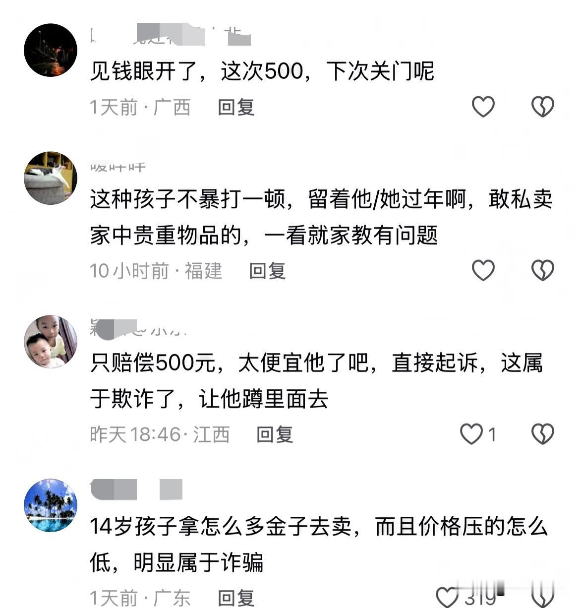 太缺德了!四川遂宁,14岁孩子偷偷把家中45克金饰拿到回收店,老板居然同意回收,而且故意压低价格,“缺斤短两”,最后只卖了2.8万,家长发现后,要求老板归还,然而老板却说金饰已经损坏,拒绝赔偿! 无奈家长找到市场监督局,反应了问题,经过市场监管部门调解,商家不但要退还饰品,还要赔偿500元损失。 想不明白小孩子是未成年人,未成年人的东西不能收,难道金店不明白吗?为了多挣钱故意压低价格,这不就是欺诈吗?对得起自己的良心吗?对于商家必须严惩! 对于家长来说,孩子偷卖家中贵重物品,必须要好好教育孩子,否则以后必然闯出大祸,到时候可就晚了。 对于这件事,大家怎么看呢? (信息来源:新晚报)