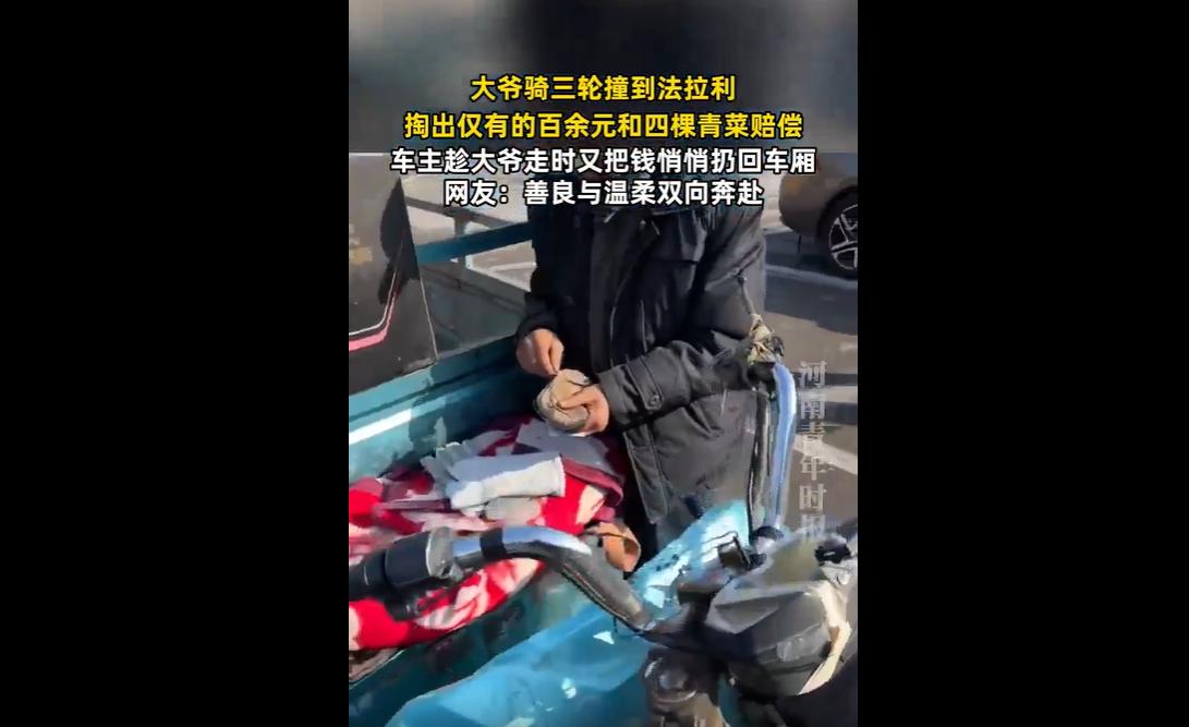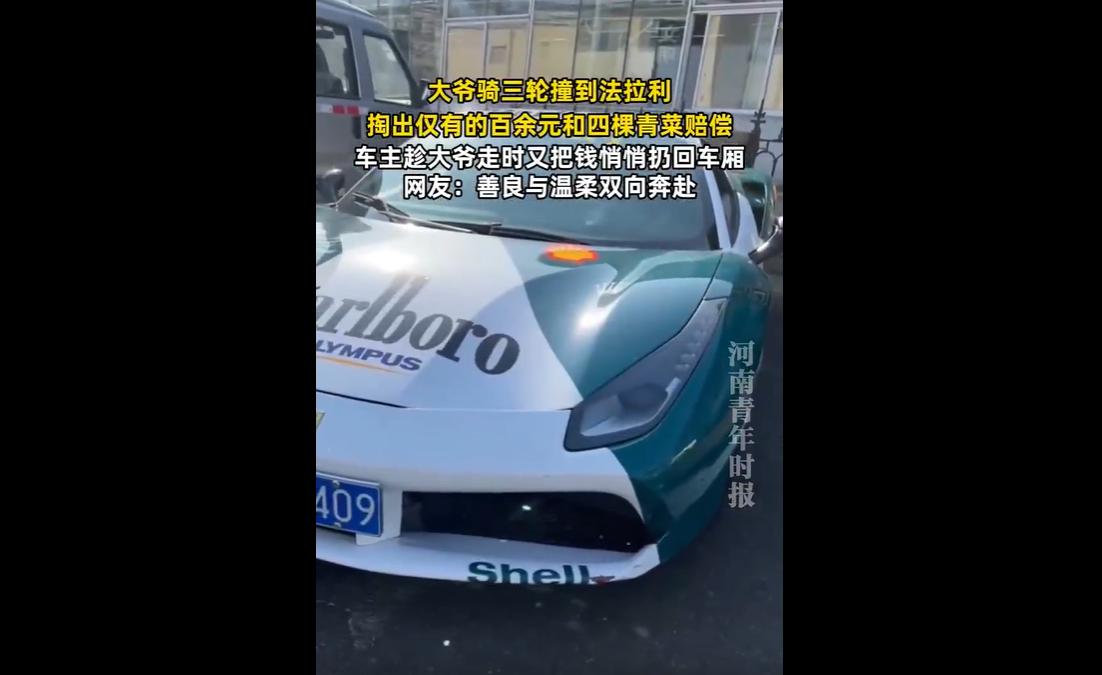近日,山东一位大爷骑三轮车不慎撞到法拉利,未逃逸而是原地等待,掏出身上仅有的163元赔偿,得知车价后又拿出4棵橄榄菜,车主最终趁大爷离开,悄悄将钱扔回其车厢,网友直呼善良与温柔双向奔赴。 163元现金,4棵橄榄菜,一场看似不起眼的车祸赔偿,却狠狠撕开了当下社会最刺眼的真相——有人满身富贵却心怀善意,有人一身清贫却坚守底线,这份双向奔赴的温柔,比豪车更珍贵,更狠狠打脸了那些肇事逃逸、推卸责任的卑劣之徒! 最令人动容的,是大爷刻在骨子里的诚信与担当,这份坚守,在当下投机取巧、自私自利的社会里,显得尤为难得。 他骑着三轮车,大概率不懂法拉利的昂贵,撞车后没有丝毫犹豫,没有趁人不备溜之大吉,而是原地静静等待车主,掏出身上所有的163元,这份“倾其所有”的真诚,不是愚蠢,而是刻在骨子里的底线与良知。 得知车价后,他又拿出4棵橄榄菜,这份朴素的补偿,无关金额,无关贵重,却是他能给出的全部,这份坦荡与负责,碾压了无数腰缠万贯却毫无担当的人。 而车主的做法,同样值得点赞,却更反衬出那些肇事逃逸者的不堪。 面对昂贵的修车费用,他没有刁难清贫的大爷,没有狮子大开口索赔,反而在大爷离开后,悄悄将钱扔回车厢,这份善意与体谅,不是妥协,而是格局与温柔。 他懂得大爷的不易,珍惜大爷的诚信,用自己的方式,守护了这份朴素的善良,也完成了一场温柔的双向奔赴。 反观当下,多少肇事逃逸事件频发:有人撞了电动车就加速逃窜,有人撞了行人就隐匿行踪,有人撞了车辆就推卸责任,甚至倒打一耙,他们握着比大爷多得多的财富,却没有大爷万分之一的担当与诚信。 他们眼里只有利益,只有逃避,没有底线,没有良知,与大爷的坦荡、车主的温柔形成鲜明对比,令人不齿又心寒。 我们之所以被这场小事感动,不仅是因为双向的温柔,更是因为我们渴望这样的诚信与善意,渴望一个人人有担当、个个有温度的社会。 大爷的163元和4棵菜,比任何昂贵的赔偿都更有分量;车主的温柔与体谅,比任何华丽的言辞都更动人。