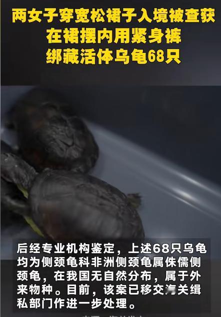 ·反华势力入侵?我国海关截查两名女子,掀开裙子一看,好家伙,大腿上密密麻麻缠满了活蹦乱跳的小乌龟,她们竟在裙下藏了68只生物! 前几天,深圳文锦渡口岸通关大厅里,一切照旧人来人往。突然,两名穿宽松长裙的女子接连引起了海关关员的警觉,她们走路姿势僵硬得像腿上绑了沙袋,眼神还老往四处飘。 经验老道的关员当场把人拦下,一掀裙子,场面直接炸了——黑色紧身裤下面,两条大腿被透明胶带裹得严严实实,里面全是被挤得乱爬的小乌龟! 第一位女子腿上绑了39只,第二位绑了29只,加起来整整68只活蹦乱跳的非洲侏儒侧颈龟。两起案子前后间隔不到五分钟,作案手法一模一样,简直是明目张胆的“人肉快递”。现在人已经移交缉私部门,后面大概率要面临行政处罚甚至刑事责任。 消息一出来,网上瞬间炸锅。有人直接脑补“境外反华势力投放生物武器”,各种阴谋论满天飞,其实冷静下来看,这根本不是什么高大上的阴谋,而是最俗套、最下三路的利益驱动。 两名女子都不是什么专业“特工”,就是普通人,为了几百块钱的带货费,心甘情愿把几十只活物用胶带捆在腿上,忍着疼、忍着痒、忍着恶心过关,在走私团伙眼里,她们就是最便宜的一次性工具,用完就能扔。 可别觉得“小乌龟而已,能有多大事”。这批非洲侏儒侧颈龟没经过任何检疫,身上很可能携带沙门氏菌、蛙壶菌之类的病原体,一旦流入市场,接触到的老人小孩最容易中招,轻则拉肚子发烧,重则直接进ICU。 更可怕的是生态那一头——中国已经有前车之鉴,巴西龟当年就是因为有人随便养、随便扔,现在已经成了很多江河湖泊的霸主,把本地龟类挤得几乎没活路。 这次的侏儒侧颈龟体型小、繁殖快、适应力强,一旦逃逸或被恶意放生,后果就是一条又一条水系的食物链被彻底打乱,几十年都未必修得回来。 说白了,这不是宠物圈的“个性化消费”,而是拿公共安全和生态红线换几百块零花钱的短视行为,海关这次出手又准又狠,正是告诉所有人:别再心存侥幸。 现在《生物安全法》摆在那儿,非法引进、释放外来物种,轻的罚到倾家荡产,重的直接判刑,没有任何灰色地带可钻。 最扎心的其实不是那68只乌龟,而是这件事暴露出来的心态——为了点小钱,就能把国门生物防线当儿戏,海关是第一道铁闸,可再严的检查也挡不住14亿人里那些把规矩当空气的人。真正的防线,其实长在我们每个人的脑子里。 异宠不是潮玩,是定时炸弹;走私不是小聪明,是拿全社会的明天赌几百块,文锦渡口岸这场“裙底保卫战”,海关打赢了,但更大的仗还在后面。 别当看客,也别当帮凶。守住绿水青山,守住子孙的生存空间,从不买、不养、不放、不帮运开始。这不是别人的事,这是我们每个中国人的底线。