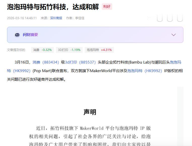 拓竹科技与泡泡玛特和解。 针对此前的IP版权纠纷问题,3月16日,泡泡玛特、拓竹科技联合宣布已达成和解,且相关问题内容内容已被进行下架处理。 拓竹科技在已发布的官方声明中提到:“目前,我们已与泡泡玛特进行了友好磋商并达成和解,相关问题内容已经全面下架。拓竹科技将继续致力于维护良好的创作生态,为用户提供更优质的创作与打印体验。” 与此同时,泡泡玛特方面也向媒体证实了和解情况属实。
