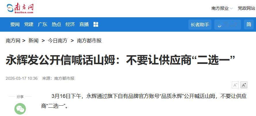永辉喊话山姆:不要让供应商二选一   据媒体报道,3月16日,永辉发布公开信喊话