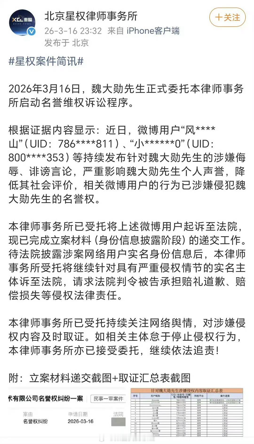 魏大勋委托律师起诉38名长期发布侮辱、诽谤言论的网络用户,用法律维护自身名誉权。网络不是法外之地,理性发言、拒绝网暴,支持合法维权。